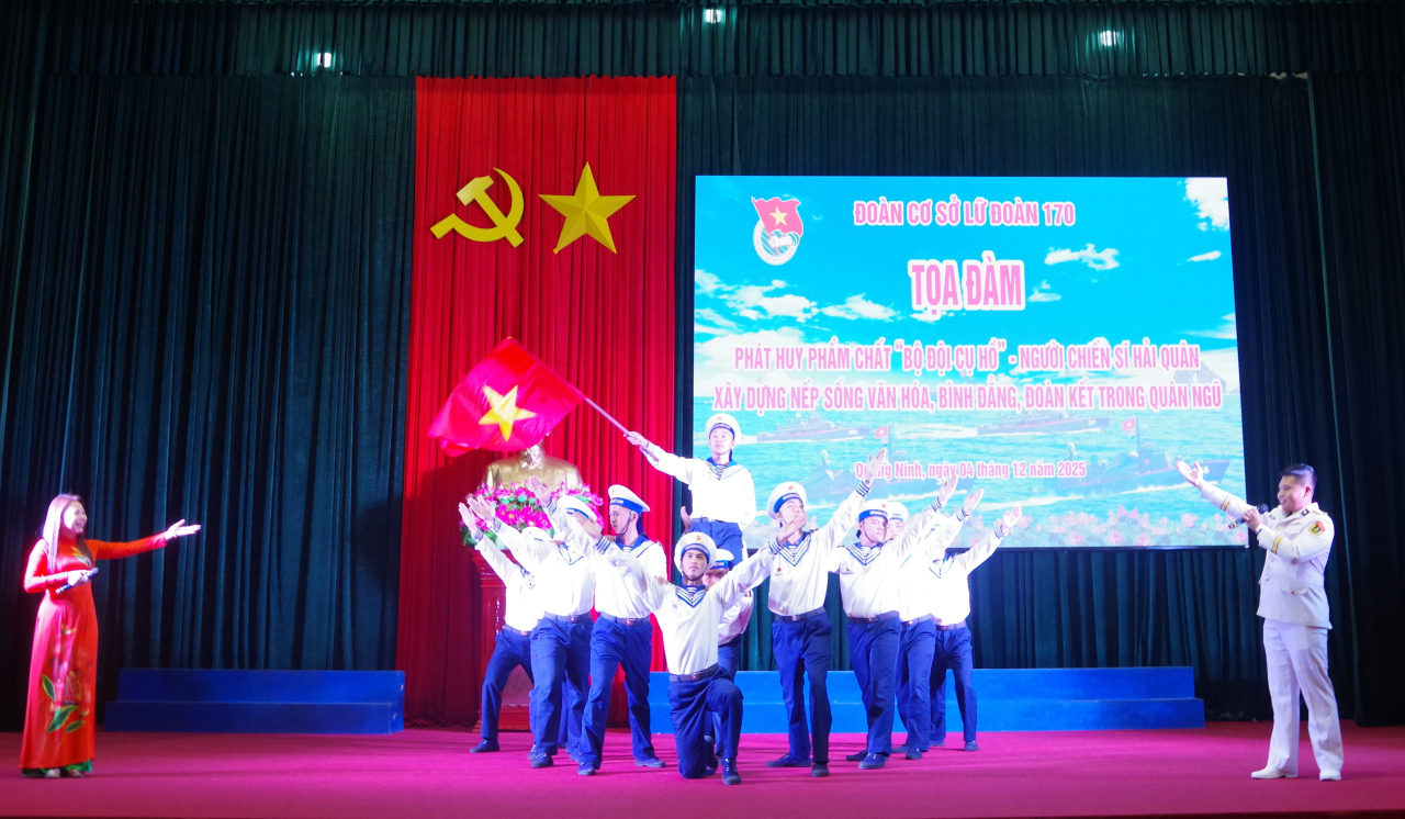HQ Online - Tối 4/12, tại phường Hà Tu, tỉnh Quảng Ninh, Đoàn cơ sở Lữ đoàn 170, Vùng 1 Hải quân tổ chức toạ đàm với chủ đề: “Phát huy phẩm chất Bộ đội Cụ Hồ - Người chiến sĩ Hải quân, xây dựng nếp sống văn hóa, bình đẳng, đoàn kết trong quân ngũ”. Đại tá Nguyễn Đình Mạnh, Bí thư Đảng ủy, Chính ủy Lữ đoàn dự và chỉ đạo.