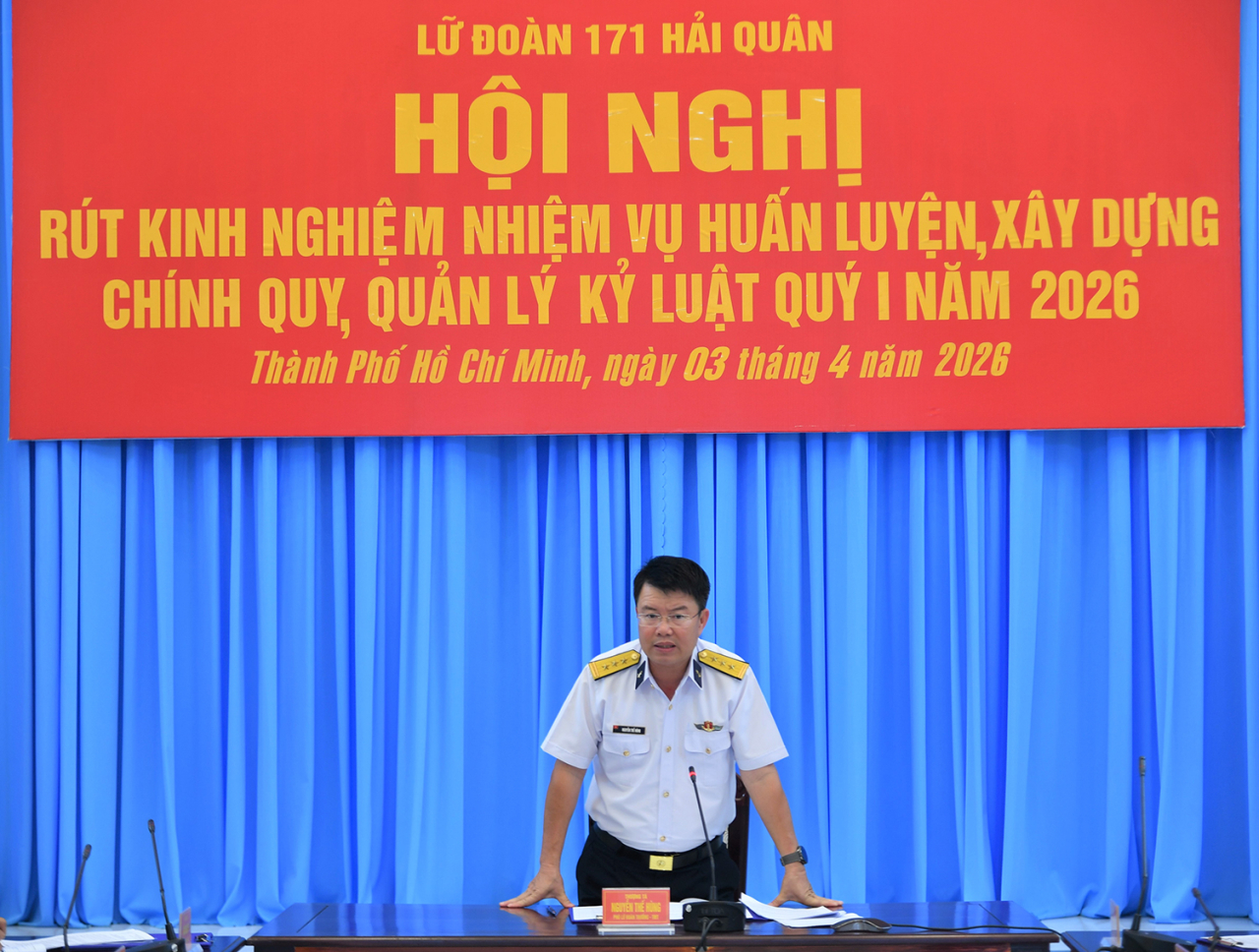 HQ Online - Chiều 3/4, tại phường Phước Thắng (TP. Hồ Chí Minh), Lữ đoàn 171, Vùng 2 Hải quân tổ chức rút kinh nghiệm thực hiện nhiệm vụ huấn luyện; xây dựng chính quy, quản lý kỷ luật quý I năm 2026. Thượng tá Nguyễn Thế Hùng, Phó Lữ đoàn trưởng, Tham mưu trưởng chủ trì.