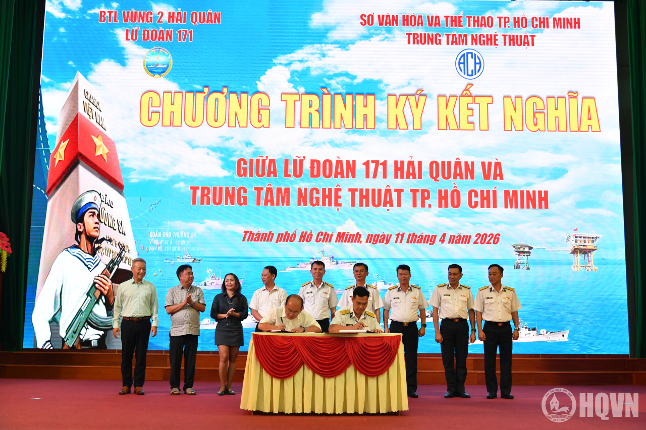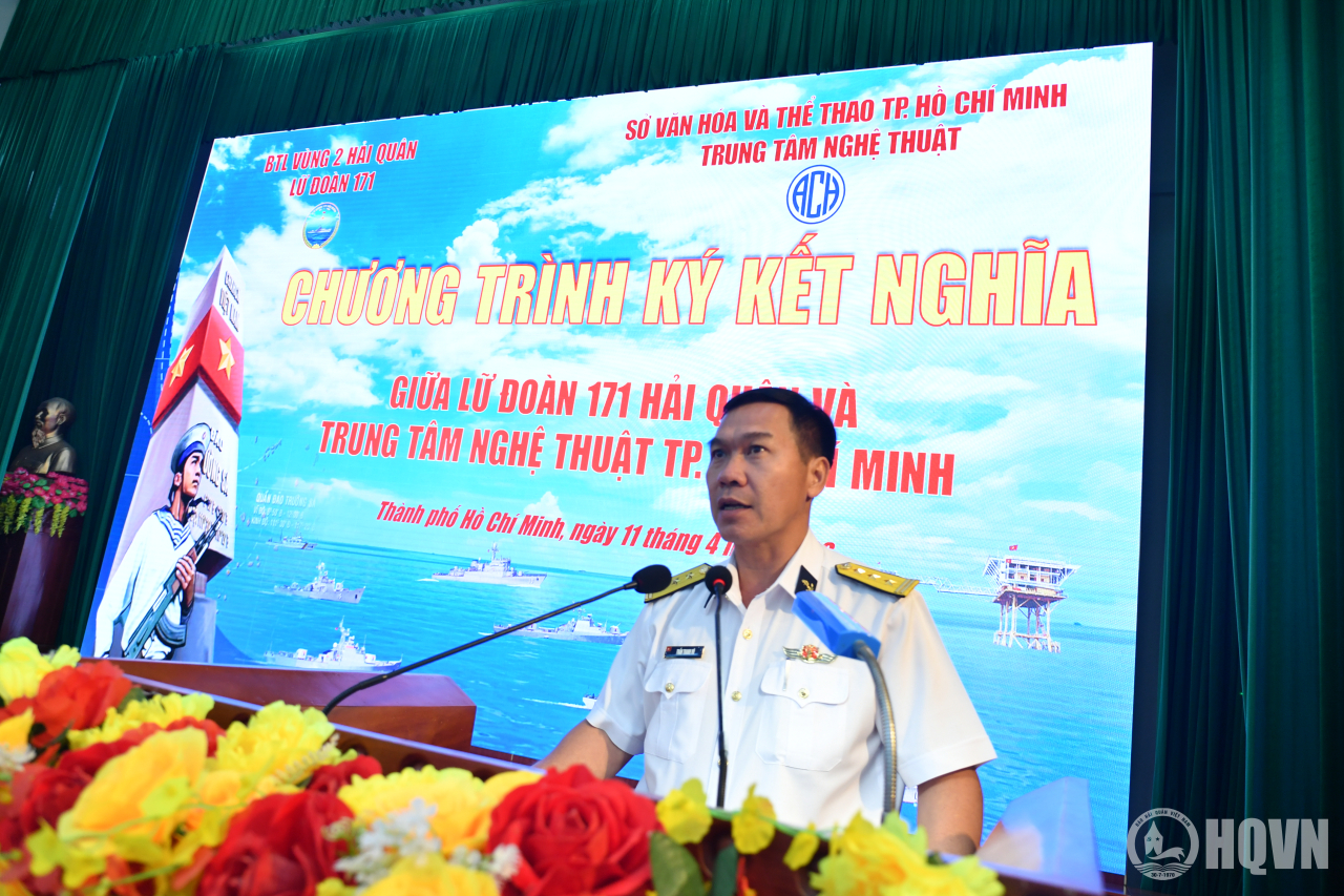 HQ Online - Chiều 11/4, tại phường Phước Thắng, Thành phố Hồ Chí Minh, Lữ đoàn 171, Vùng 2 Hải quân phối hợp với Trung tâm Nghệ thuật Thành phố Hồ Chí Minh tổ chức ký kết nghĩa giữa hai đơn vị. Đại tá Phạm Ngọc Quý, Chủ nhiệm Chính trị Vùng dự chương trình.