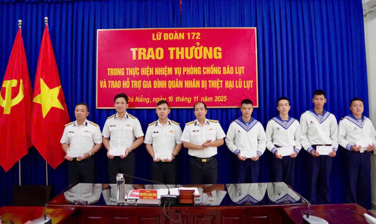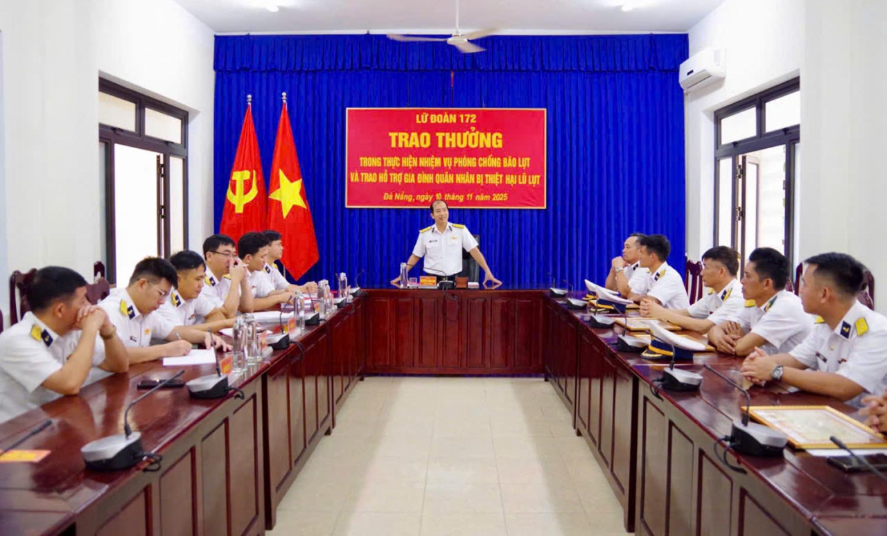 HQ Online - Ngày 10/11, tại TP. Đà Nẵng, Lữ đoàn 172, Vùng 3 Hải quân tổ chức trao thưởng các tập thể, cá nhân có thành tích tốt trong thực hiện nhiệm vụ phòng chống và khắc phục hậu quả bão lụt; hỗ trợ các gia đình quân nhân bị thiệt hại trong các đợt mưa bão thời gian qua. Đại tá Nguyễn Xuân Hòa, Chính ủy Lữ đoàn chủ trì.