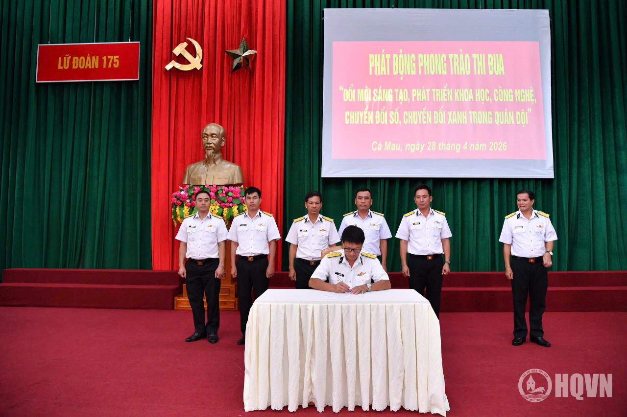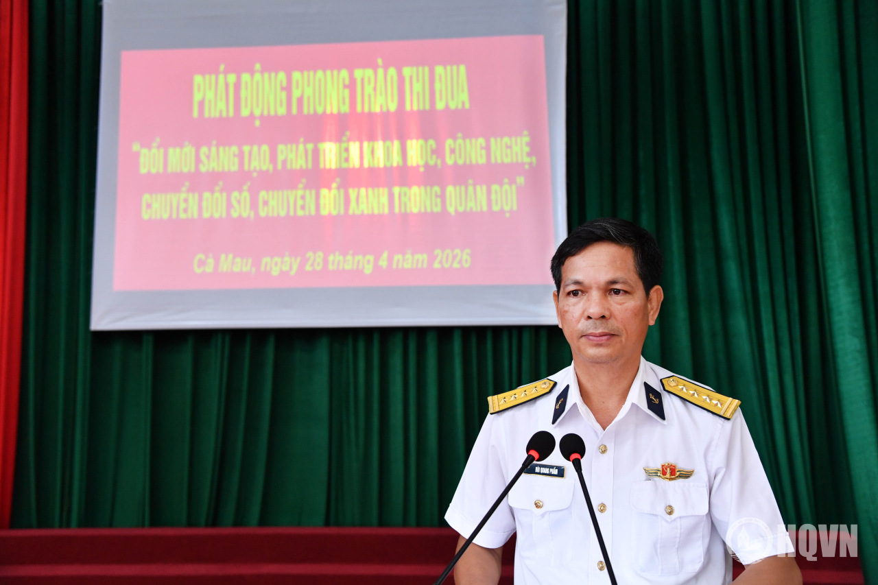HQ Online - Chiều 28/4, tại xã Năm Căn, tỉnh Cà Mau, Lữ đoàn 175 tổ chức phát động phong trào thi đua “Đổi mới sáng tạo, phát triển KHCN, chuyển đổi số, chuyển đổi xanh”. Đại tá Bùi Quang Phẩm, Bí thư Đảng ủy, Chính ủy Lữ đoàn chủ trì.