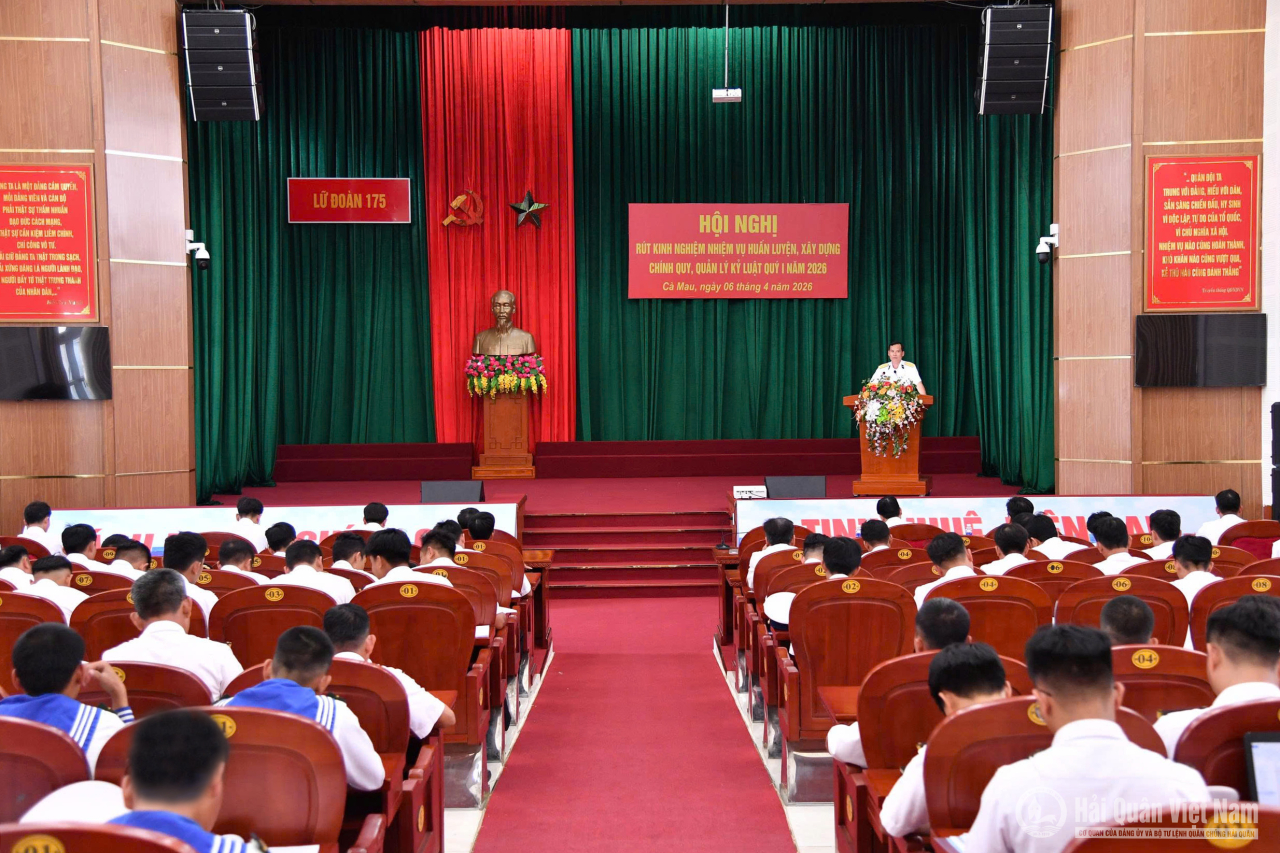 HQ Online - Chiều 6/4, tại xã Năm Căn, tỉnh Cà Mau, Lữ đoàn 175 (Vùng 5 Hải quân) tổ chức Hội nghị rút kinh nghiệm nhiệm vụ huấn luyện, xây dựng chính quy, quản lý kỷ luật quý I năm 2026. Đại tá Nguyễn Văn Cường, Lữ đoàn trưởng chủ trì.