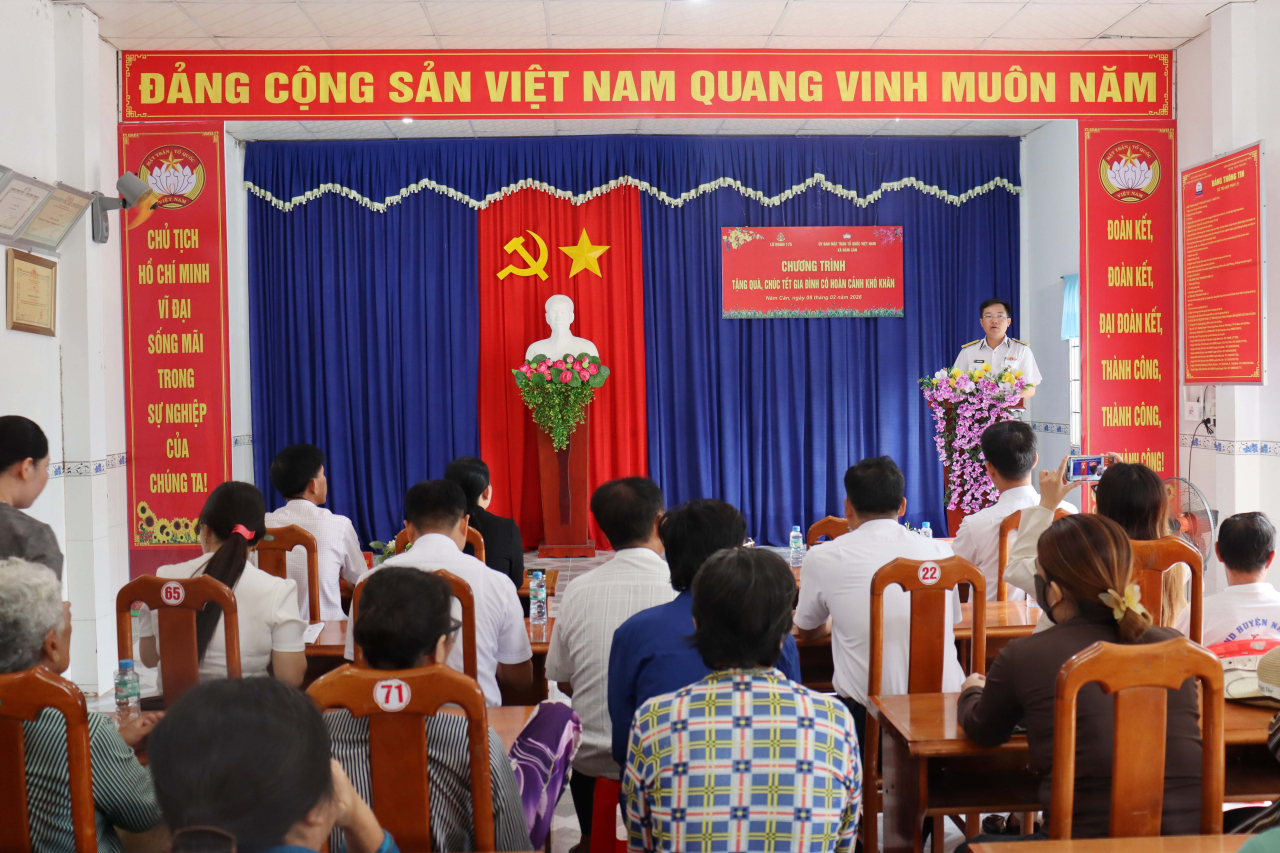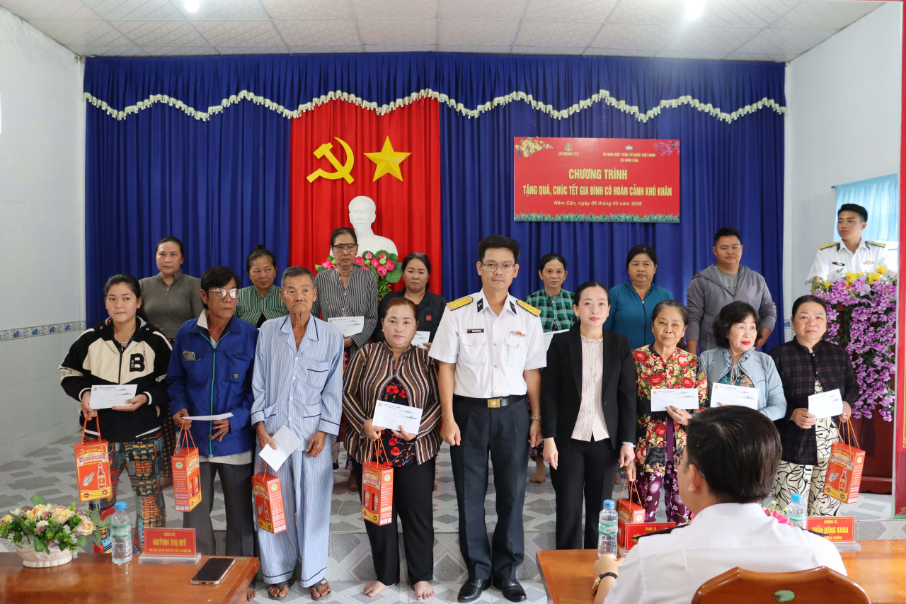 HQ Online - Ngày 8/2, tại xã Năm Căn, tỉnh Cà Mau, Lữ đoàn 175, Vùng 5 Hải quân phối hợp với cấp ủy, chính quyền xã Năm Căn tổ chức chương trình tặng quà, chúc Tết các hộ gia đình có hoàn cảnh khó khăn trên địa bàn nhân dịp Tết Nguyên đán Bính Ngọ 2026.