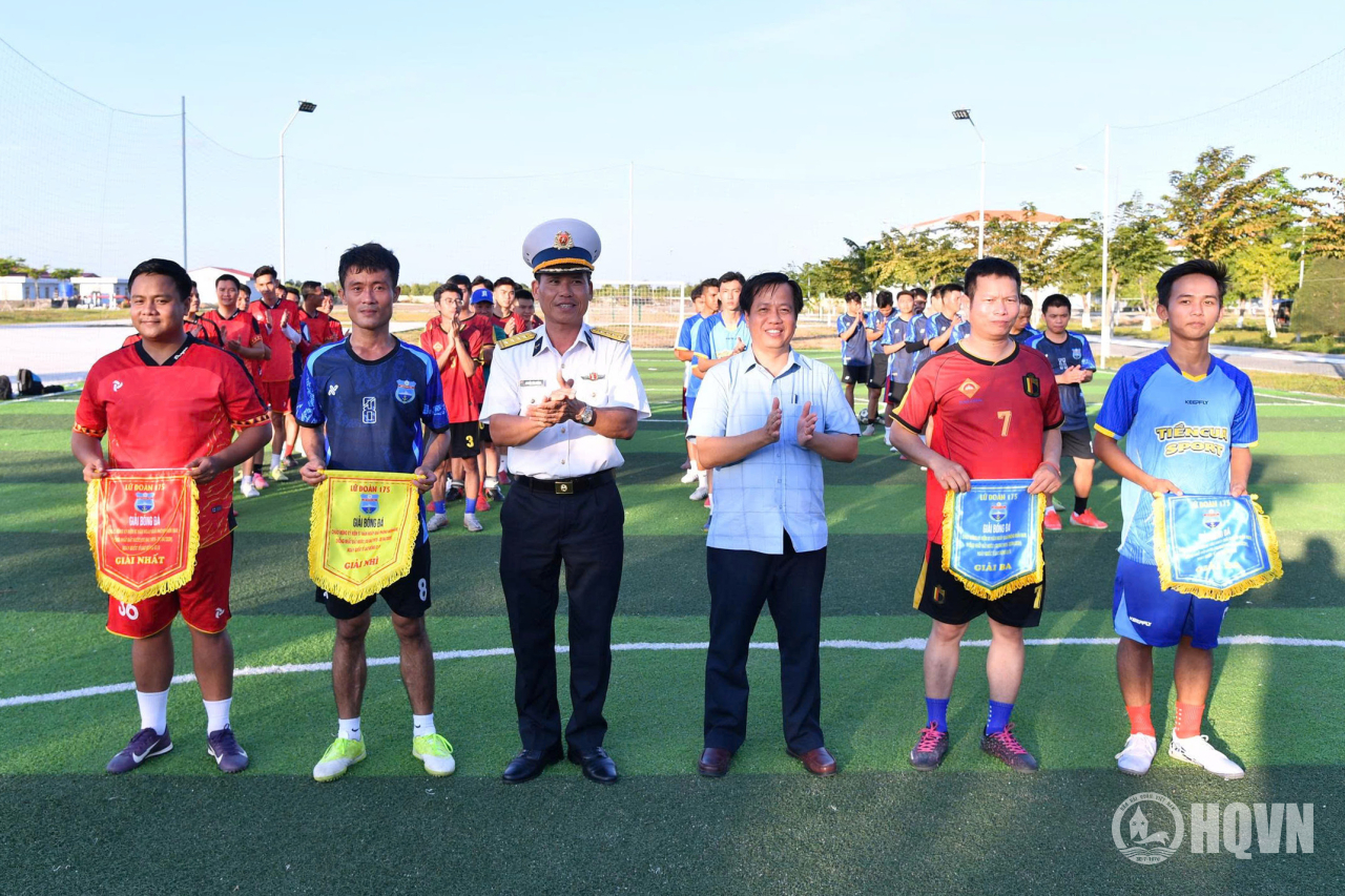Đại tá Nguyễn Văn Cường, Lữ đoàn trưởng Lữ đoàn 175 và đồng chí Huỳnh Minh Kiên, Bí thư Đảng uỷ, Chủ tịch Hội đồng nhân dân xã Năm Căn trao giải cho các đội bóng