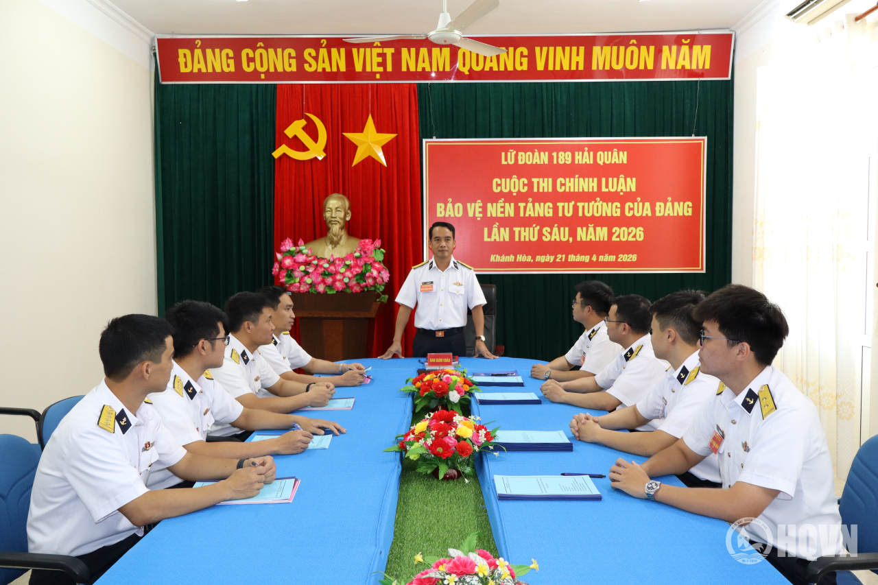 HQ Online - Ngày 21/4, tại phường Bắc Cam Ranh, tỉnh Khánh Hòa, Lữ đoàn 189 Hải quân tổ chức chấm điểm, đánh giá các tác phẩm tham gia Cuộc thi chính luận bảo vệ nền tảng tư tưởng của Đảng lần thứ VI năm 2026. Trung tá Hà Văn Tý, Phó Chính ủy Lữ đoàn, Trưởng ban giám khảo Cuộc thi dự và chỉ đạo.