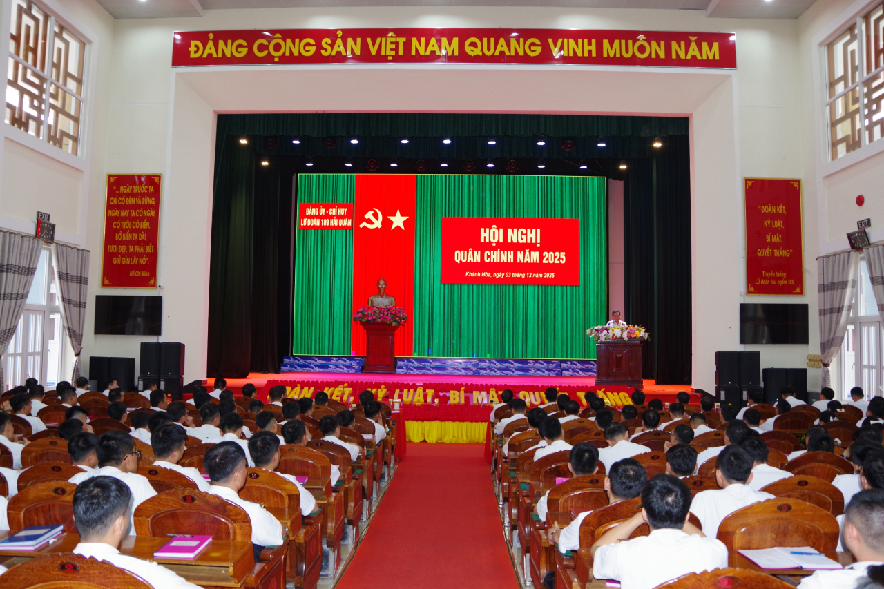 HQ Online - Ngày 3/12, tại phường Bắc Cam Ranh, tỉnh Khánh Hoà, Lữ đoàn 189 Hải quân tổ chức Hội nghị Quân chính năm 2025. Chuẩn Đô đốc Nguyễn Đình Hùng, Phó Tư lệnh Quân chủng dự và chỉ đạo. Thượng tá Nguyễn Tiến Đoạt, Lữ đoàn trưởng chủ trì; Thượng tá Hoàng Văn Đồng, Bí thư Đảng uỷ, Chính uỷ Lữ đoàn quán triệt Nghị quyết lãnh đạo thực hiện nhiệm vụ năm 2026 của Đảng uỷ Lữ đoàn.