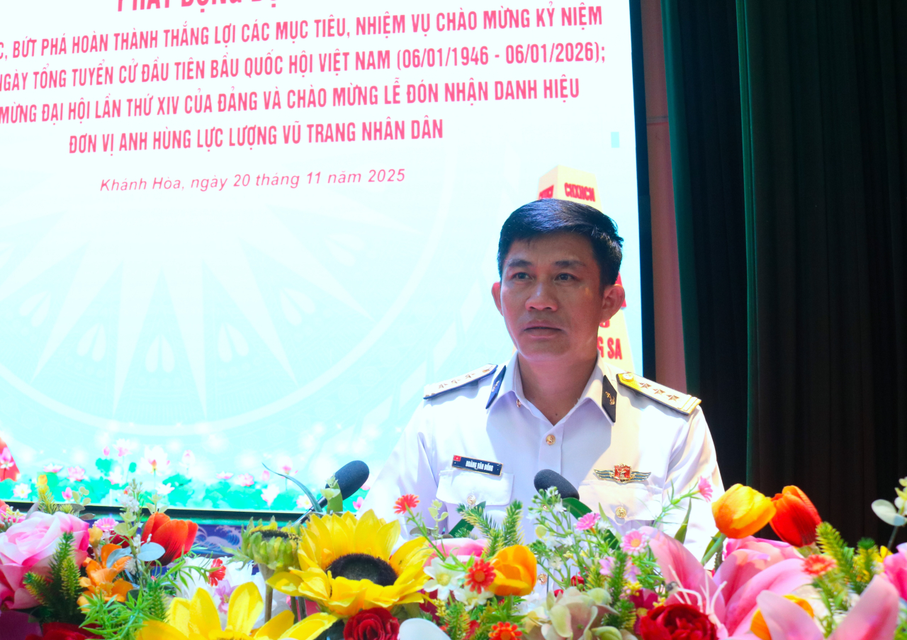 HQ Online - Ngày 20/11, tại phường Bắc Cam Ranh, tỉnh Khánh Hòa, Lữ đoàn 189 Hải quân tổ chức phát động đợt thi đua tăng tốc, bứt phá hoàn thành thắng lợi các mục tiêu, nhiệm vụ, chào mừng kỷ niệm 80 năm Ngày tổng tuyển cử đầu tiên bầu Quốc hội Việt Nam (6/1/1946 - 6/1/2026), Đại hội lần thứ XIV của Đảng và chuẩn bị đón nhận danh hiệu đơn vị Anh hùng lực lượng vũ trang nhân dân. Thượng tá Hoàng Văn Đồng, Bí thư Đảng ủy, Chính ủy Lữ đoàn chủ trì.