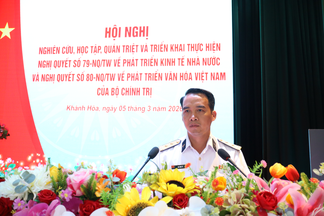 HQ Online - Ngày 5/3, tại phường Bắc Cam Ranh, tỉnh Khánh Hòa, Lữ đoàn 189 Hải quân tổ chức Hội nghị nghiên cứu, học tập, quán triệt và triển khai thực hiện Nghị quyết số 79-NQ/TW về phát triển kinh tế nhà nước và Nghị quyết số 80-NQ/TW về phát triển văn hóa Việt Nam của Bộ Chính trị. Trung tá Hà Văn Tý, Phó Chính ủy Lữ đoàn chủ trì và trực tiếp quán triệt các nội dung.