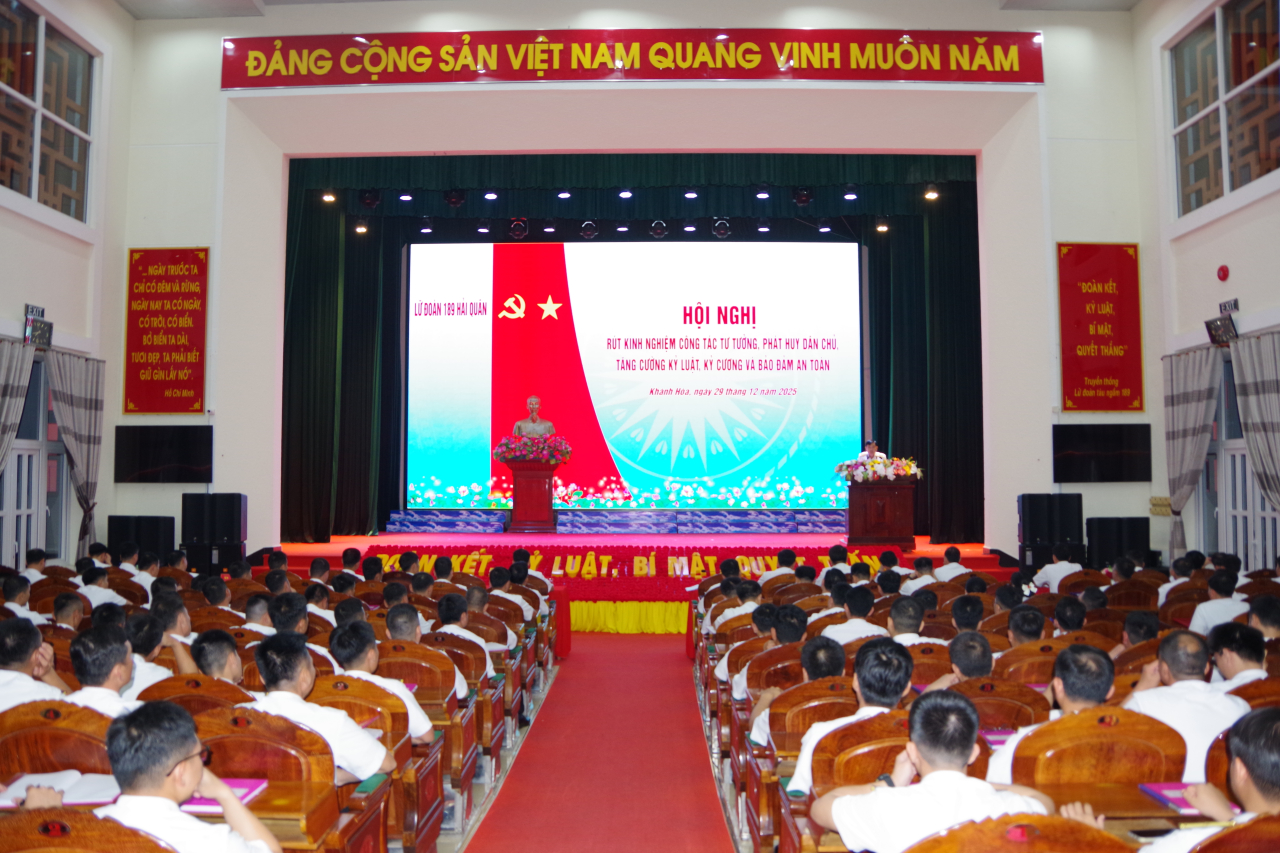 HQ Online - Ngày 29/12, tại phường Bắc Cam Ranh, tỉnh Khánh Hòa, Lữ đoàn 189 Hải quân tổ chức Hội nghị rút kinh nghiệm công tác quản lý tư tưởng, phát huy dân chủ, tăng cường kỷ luật, kỷ cương và bảo đảm an toàn. Thượng tá Nguyễn Tiến Đoạt, Lữ đoàn trưởng chủ trì hội nghị.
