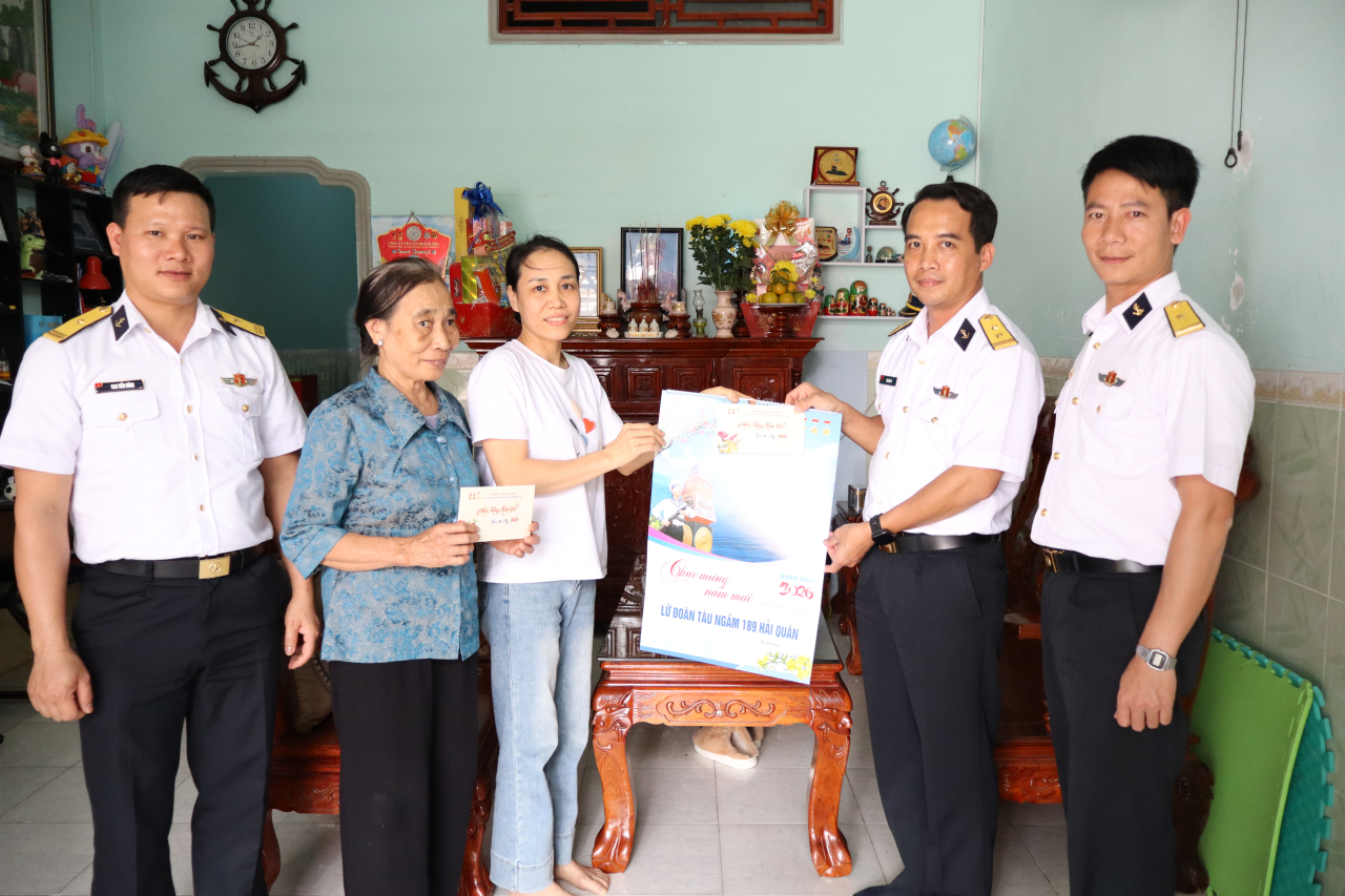 Đoàn công tác của Lữ đoàn cũng tới thăm, động viên và tặng quà cho gia đình liệt sĩ và hai cháu là con ngư dân có hoàn cảnh khó khăn do Lữ đoàn nhận đỡ đầu tại xã Cam Lâm. Đoàn công tác động viên hai cháu cố gắng học tập thật tốt, để trở thành những công dân tốt, góp phần xây dựng đất nước trong kỷ nguyên mới.