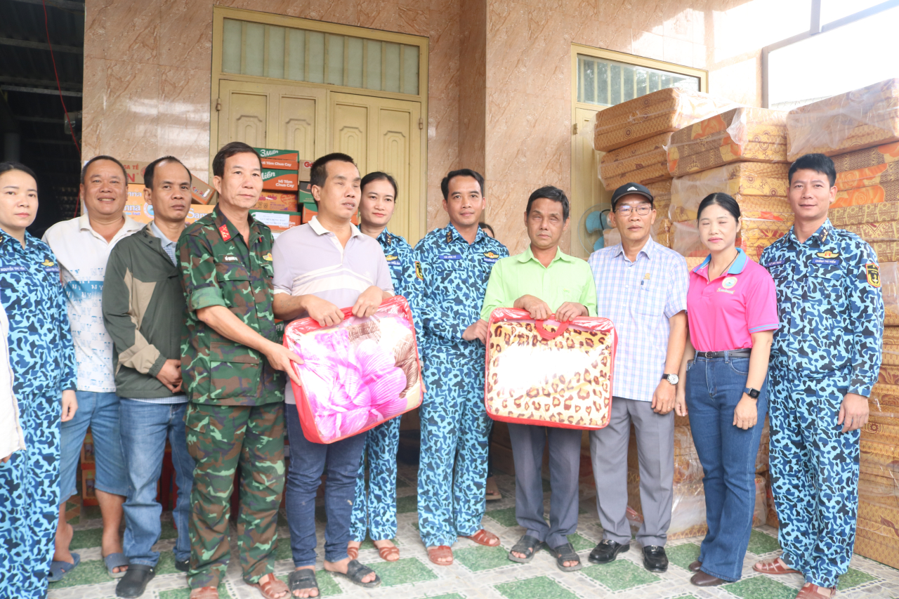 Đoàn công tác đã trao tặng 150 tấm đệm, cùng với chăn, ga, màn và các nhu yếu phẩm phục vụ đời sống của bà con những ngày sau lũ lụt.