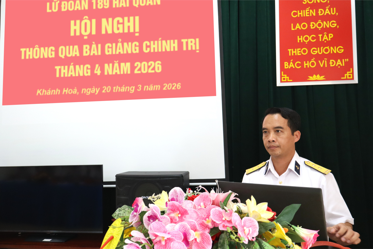 HQ Online - Ngày 20/3, tại phường Bắc Cam Ranh, tỉnh Khánh Hòa, Lữ đoàn 189 tổ chức Hội nghị thông qua bài giảng chính trị tháng 4 năm 2026. Trung tá Hà Văn Tý, Phó Chính ủy Lữ đoàn chủ trì.