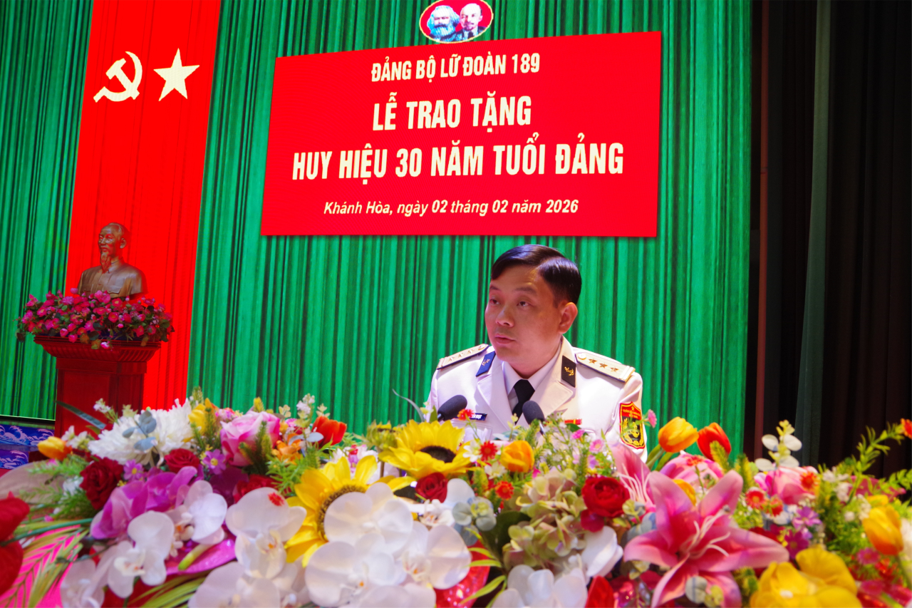 HQ Online - Ngày 2/2, tại phường Bắc Cam Ranh, tỉnh Khánh Hòa, Đảng ủy Lữ đoàn 189 Hải quân tổ chức Lễ trao tặng Huy hiệu 30 năm tuổi Đảng cho Trung tá QNCN Trương Duy Khánh, đảng viên, Chi bộ 2 thuộc Đảng bộ bộ phận Phòng Hậu cần - Kỹ thuật. Thượng tá Nguyễn Tiến Đoạt, Phó Bí thư Đảng ủy, Lữ đoàn trưởng chủ trì.