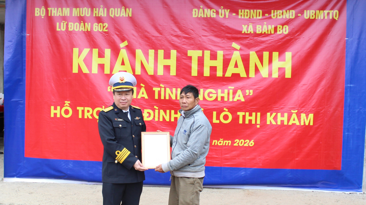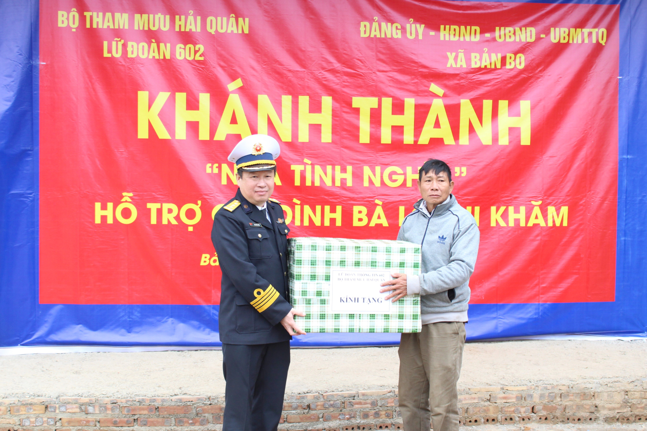HQ Online - Sáng 10/1, tại Lai Châu, Lữ đoàn Thông tin 602, Bộ Tham mưu Hải quân phối hợp với cấp ủy, chính quyền xã Bản Bo, tỉnh Lai Châu, tổ chức khánh thành và bàn giao nhà tình nghĩa tặng gia đình bà Lò Thị Khăm, sinh năm 1929, là mẹ Liệt sĩ Lò Văn Phốm, hy sinh năm 1978 tại biên giới phía Bắc.