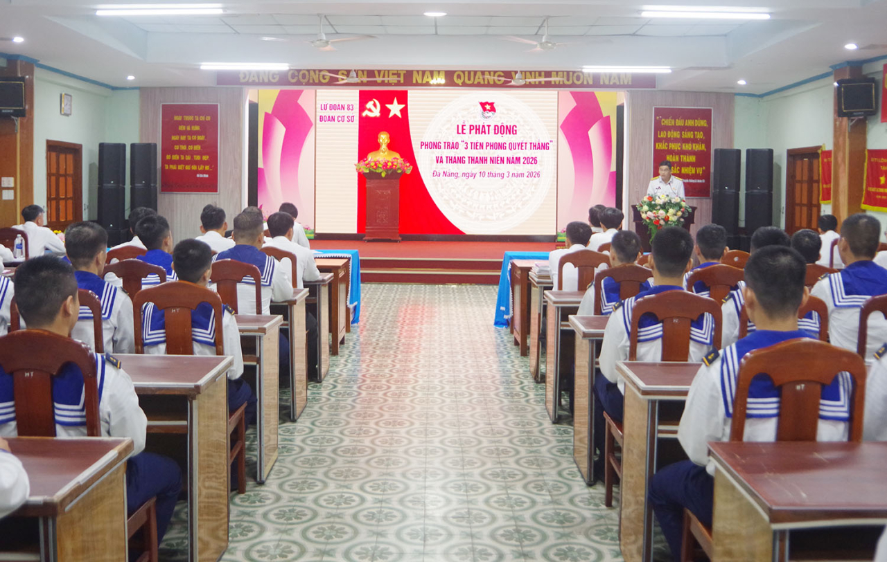 HQ Online - Sáng 10/3, tại TP. Đà Nẵng, Đoàn cơ sở Lữ đoàn Công binh 83 Hải quân tổ chức Lễ phát động phong trào “3 tiên phong quyết thắng” giai đoạn 2025-2030 và Tháng Thanh niên năm 2026 với chủ đề “Tuổi trẻ Lữ đoàn 83 đoàn kết, xung kích, sáng tạo, tô hồng truyền thống”. Đại tá Trần Thức, Bí thư Đảng ủy, Chính ủy Lữ đoàn dự và chỉ đạo.