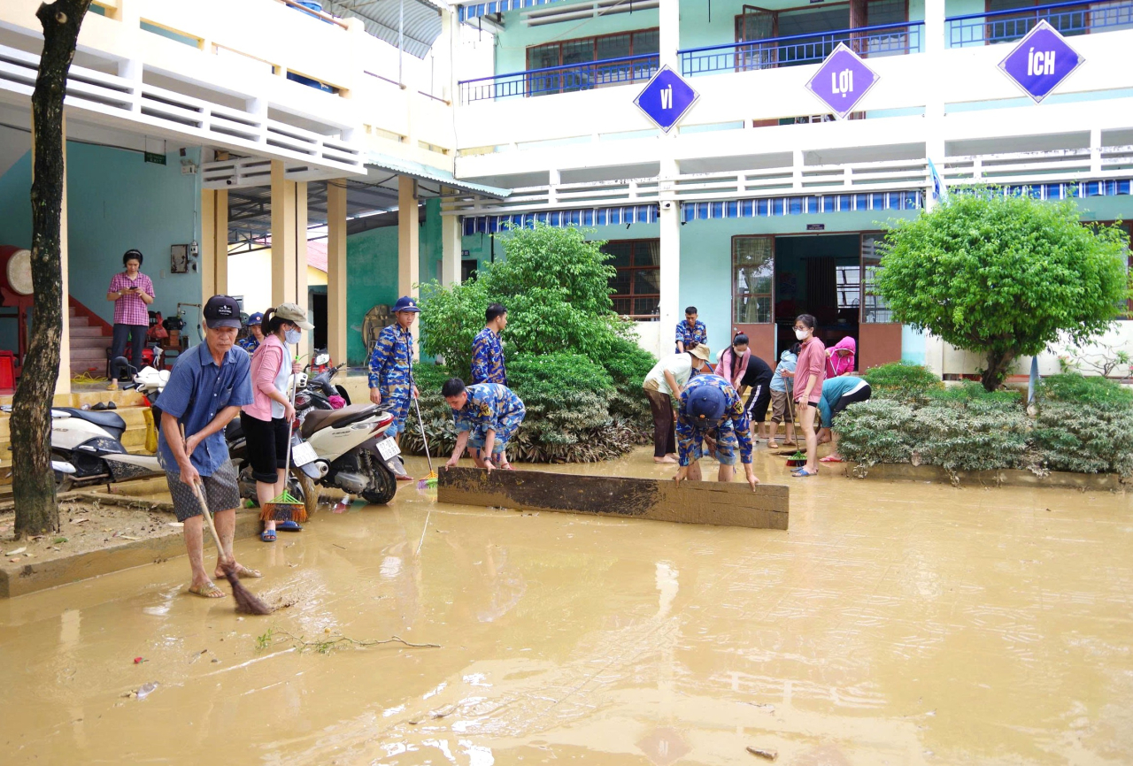 Cán bộ, chiến sĩ Lữ đoàn 83 giúp các điểm trường trên địa bàn phường Điện Bàn Tây khắc phục hậu quả mưa lũ