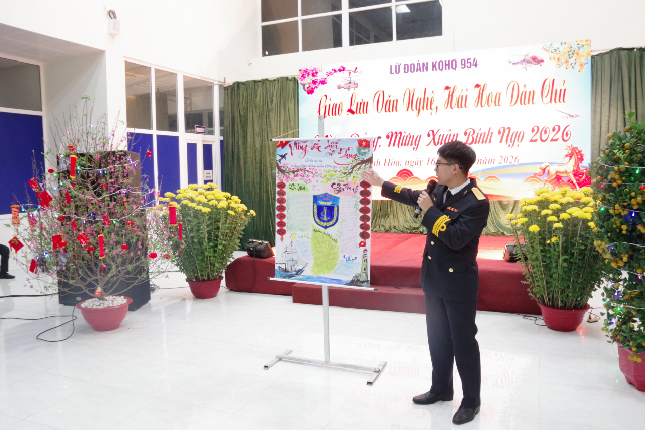 Tối cùng ngày, chương trình giao lưu văn nghệ, hái hoa dân chủ với chủ đề mừng Đảng, mừng Xuân được tổ chức trong không khí ấm áp, nghĩa tình. Các tiết mục ca, múa, hoạt cảnh ca ngợi Đảng, Tổ quốc, quê hương, biển đảo và người chiến sĩ Hải quân tạo điểm nhấn sâu sắc, góp phần nâng cao đời sống văn hóa tinh thần, thắt chặt tình đoàn kết nội bộ.