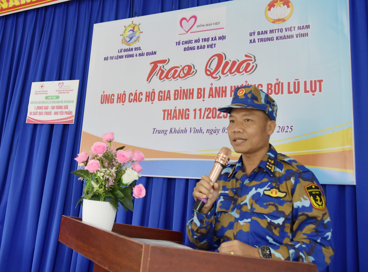 Đại tá Đỗ Văn Sơn, Chính ủy Lữ đoàn 955 chia sẻ tại buổi trao quà: Thấu hiểu những khó khăn mà nhân dân vùng mưa lũ đã và đang phải đối mặt, Lữ đoàn 955 đã cố gắng kết nối, phối hợp với các tổ chức xã hội, doanh nghiệp cùng chính quyền địa phương hỗ trợ kịp thời, hiệu quả, thiết thực với nhu cầu của bà con. Đây không chỉ là sự hỗ trợ về vật chất mà còn thể hiện tình cảm, trách nhiệm và sự sẻ chia của bộ đội Hải quân và cộng đồng đối với đồng bào vùng lũ.
