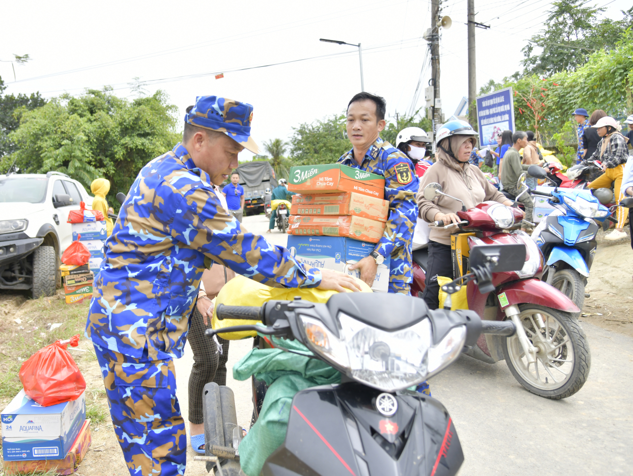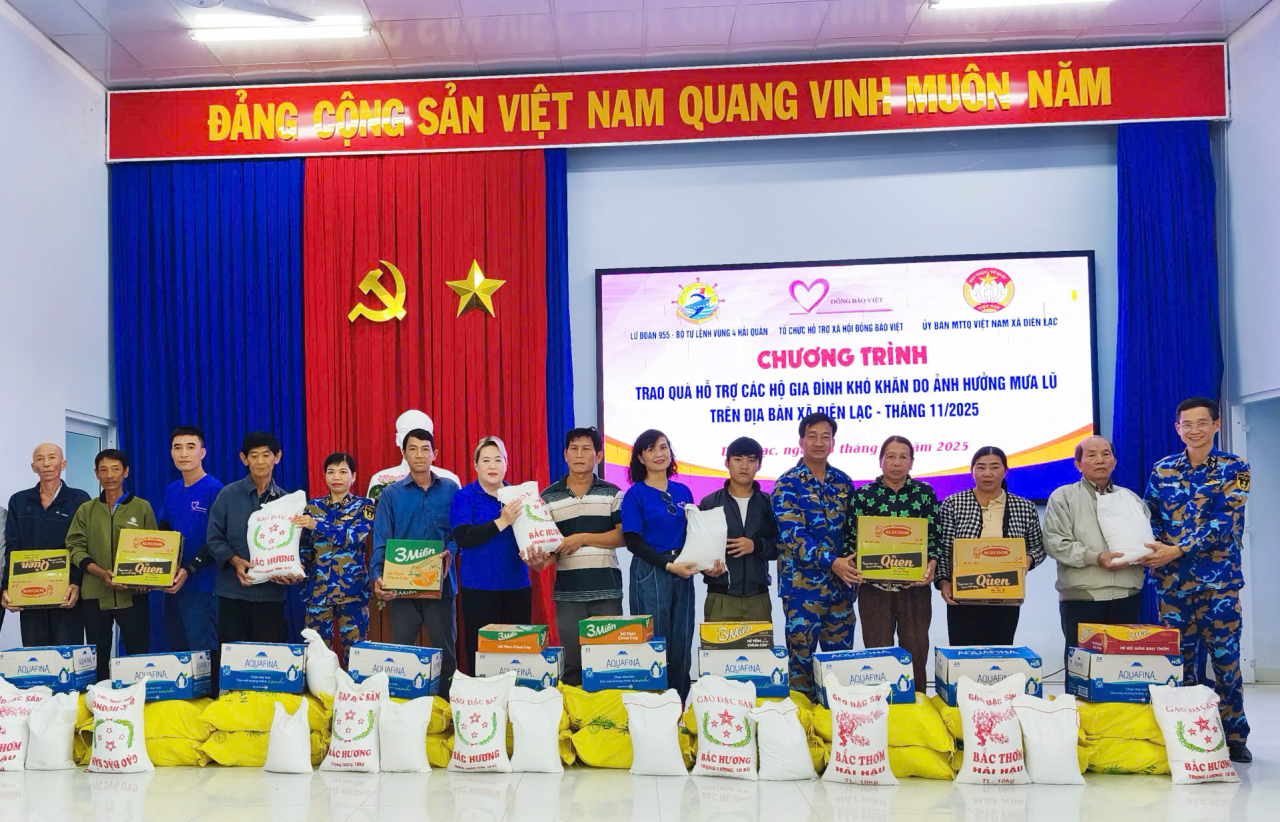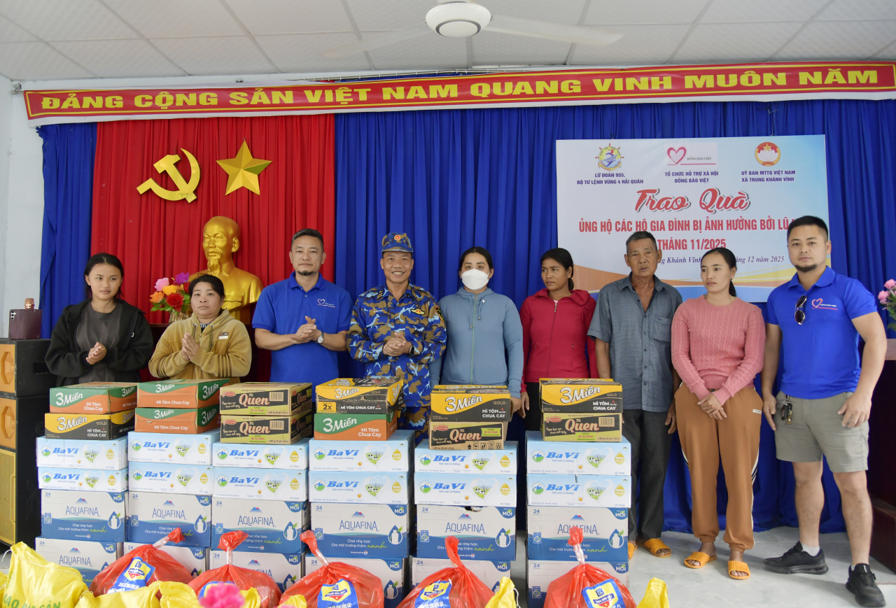 HQ Online - Ngày 5/12, Lữ đoàn 955, Vùng 4 Hải quân phối hợp với Tổ chức Hỗ trợ xã hội Đồng bào Việt (Hà Nội), Công ty Cổ phần Giải pháp Thời tiết Weatherplus và chính quyền địa phương, trao quà hỗ trợ nhân dân bị thiệt hại do mưa lũ tại các xã Trung Khánh Vĩnh, Nam Khánh Vĩnh và Diên Lạc của tỉnh Khánh Hòa.