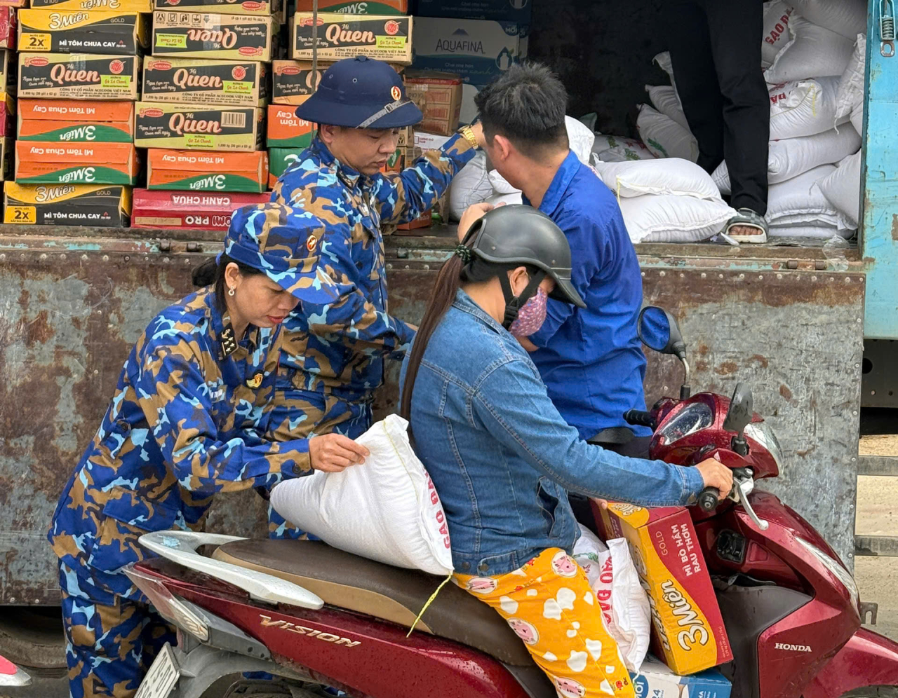 Hỗ trợ tại xã Diên Lạc, đoàn trao 6,5 tấn gạo, 100 thùng nước, 100 thùng mì tôm và 7 thùng lương khô cho 100 hộ dân chịu ảnh hưởng nặng nề do ngập sâu.