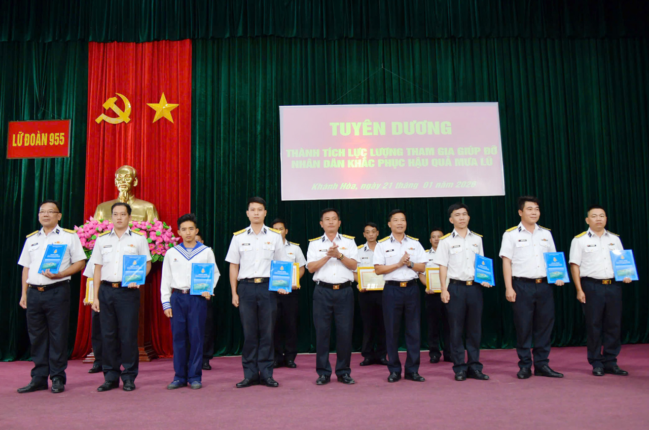 HQ Online - Chiều 21/1, tại Khánh Hòa, Lữ đoàn 955, Vùng 4 Hải quân tổ chức tuyên dương 29 cá nhân có thành tích tiêu biểu trong tham gia giúp nhân dân khắc phục hậu quả mưa lũ trên địa bàn tỉnh Khánh Hòa trong tháng 11/2025; trao hỗ trợ quân nhân bị thiệt hại do mưa lũ và phát động phong trào thi đua quyết thắng năm 2026.