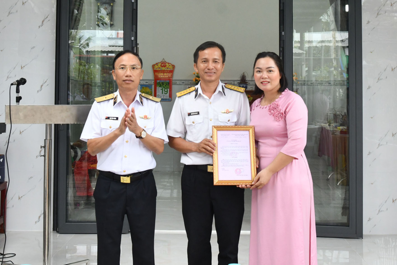 Chuẩn Đô đốc Ngô Văn Thành, Chính ủy Vùng 5 Hải quân trao quyết định bàn giao nhà đồng đội cho gia đình Đại úy quân nhân chuyên nghiệp Nguyễn Hữu Quý