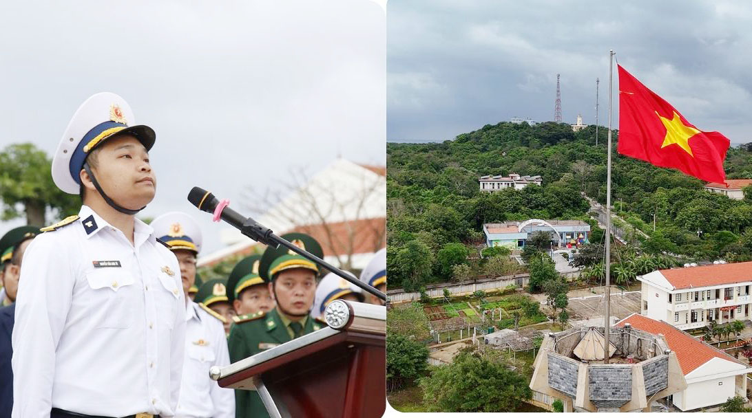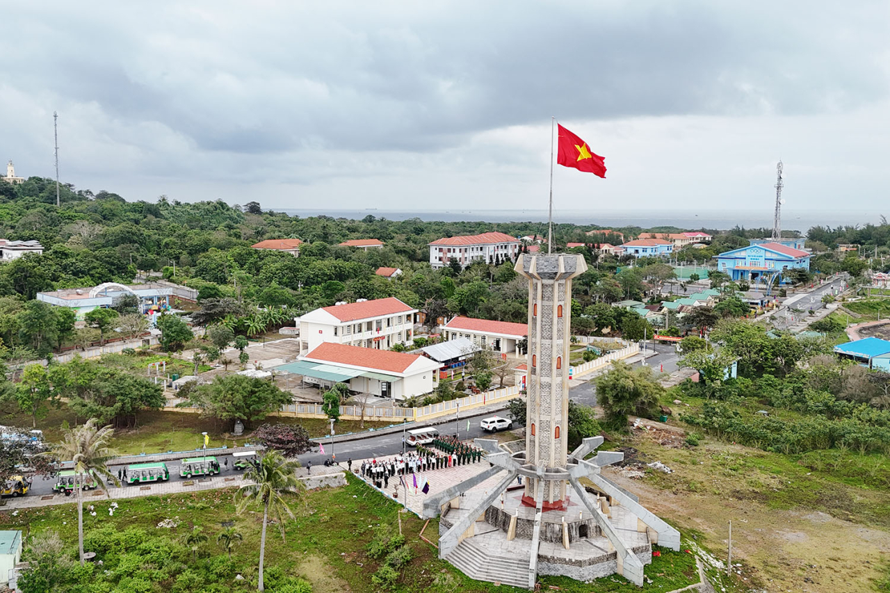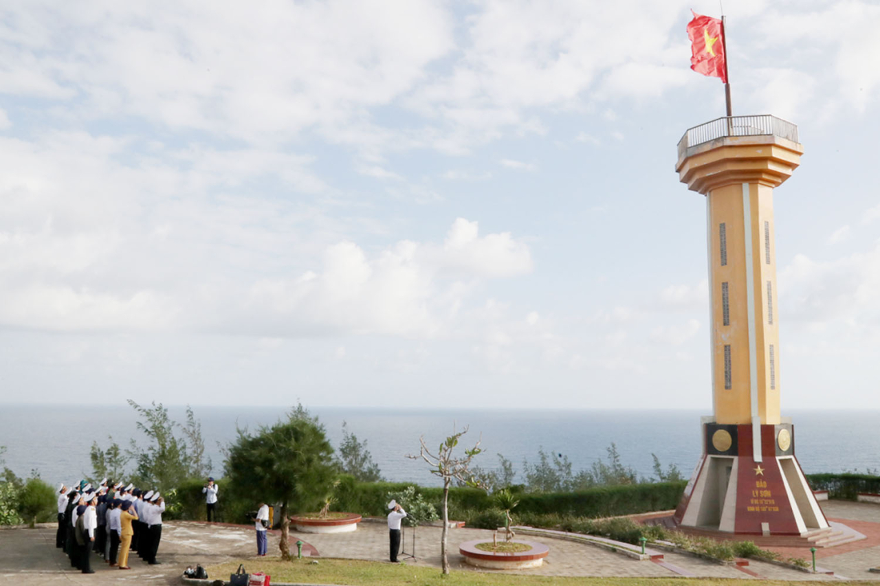 Lễ chào cờ dưới chân cột cờ trên núi Thới Lới, được đoàn công tác tổ chức ngay sau khi đặt chân lên đặc khu Lý Sơn