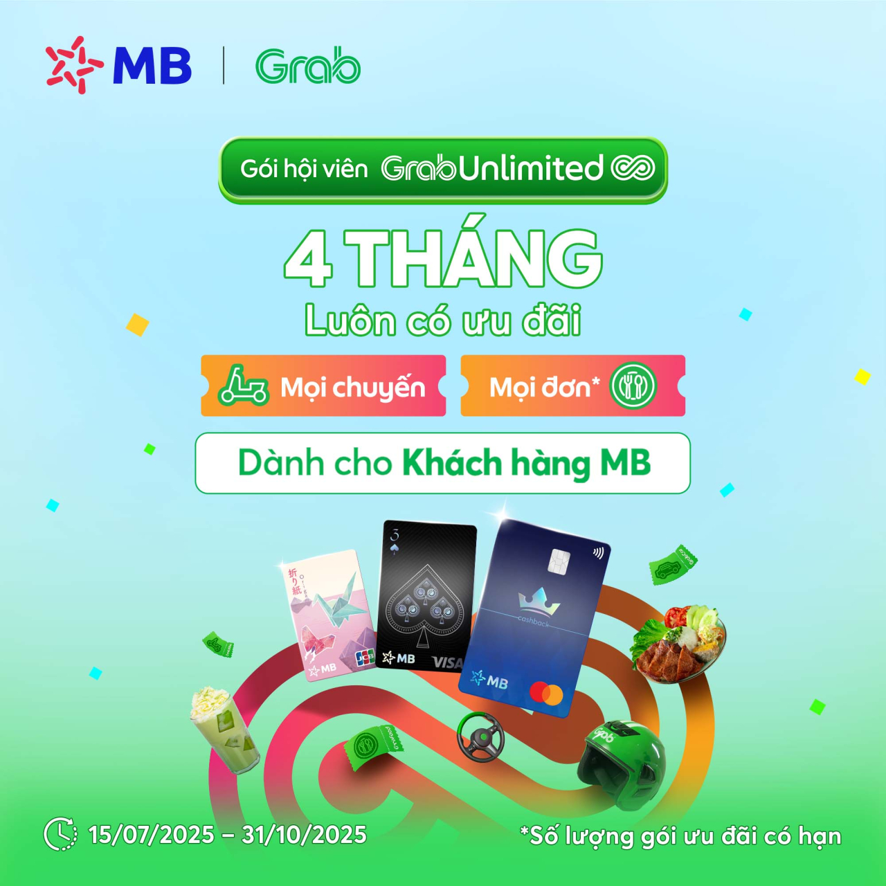 - Áp dụng với Khách hàng đang sử dụng gói MB Subscription/Chủ thẻ MB chưa chi tiêu thẻ trong tháng 7/2025 và lần đầu tham gia Gói Hội Viên GrabUnlimited;