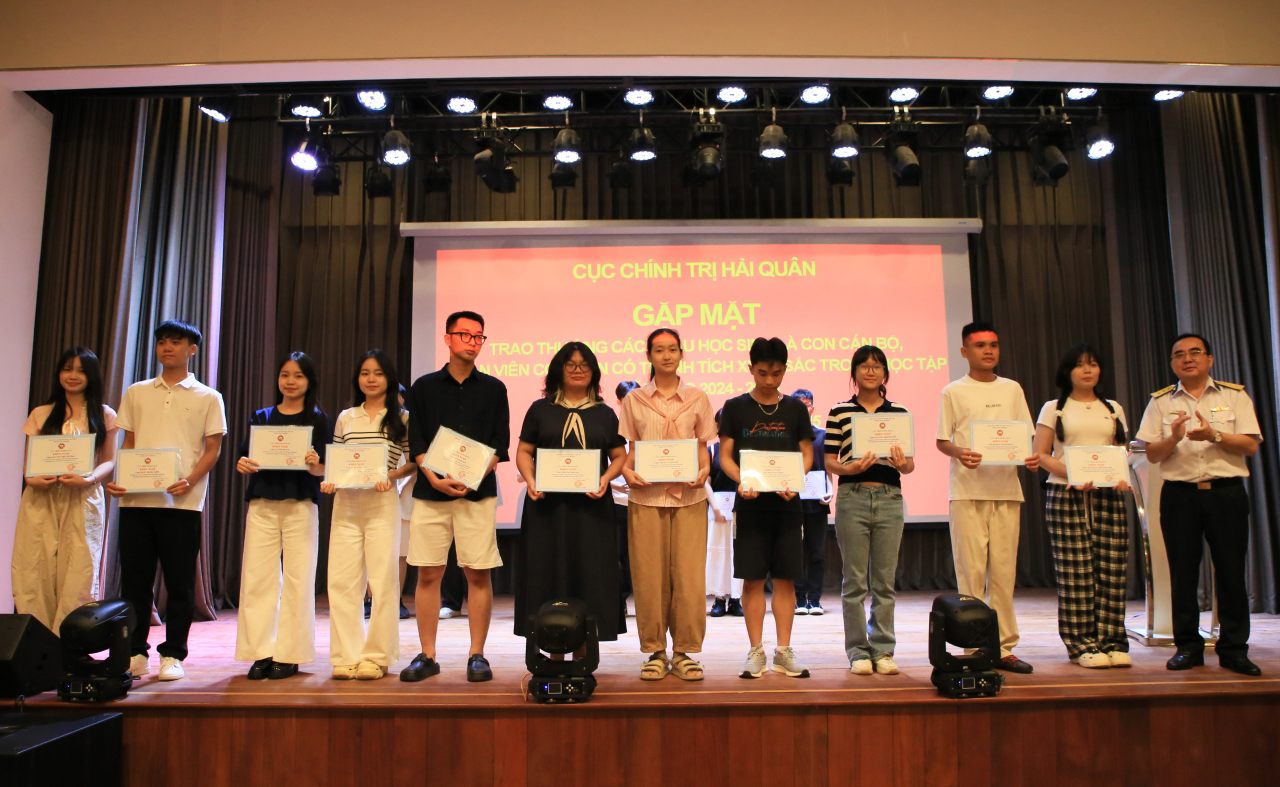 Khen thưởng học sinh giỏi là con cán bộ, nhân viên Cục Chính trị Hải quân. Ảnh: Thùy Liên