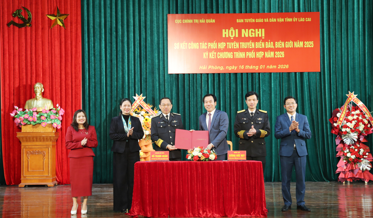 Thủ trưởng Cục Chính trị Hải quân và lãnh đạo Ban Tuyên giáo và Dân vận tỉnh Lào Cai trao văn bản ký kết Chương trình phối hợp tuyên truyền biển đảo năm 2026. Ảnh: Duy Khánh