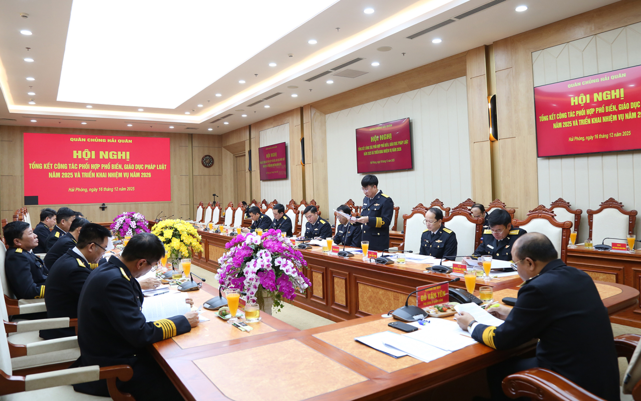 HQ Online - Sáng 16/12 tại Hải Phòng, Quân chủng Hải quân tổ chức Hội nghị tổng kết công tác phổ biến, giáo dục pháp luật (PBGDPL) năm 2025 và triển khai nhiệm vụ năm 2026. Chuẩn Đô đốc Đỗ Văn Yên, Phó Chính ủy Hải quân, Chủ tịch Hội đồng phối hợp PBGDPL Quân chủng chủ trì.