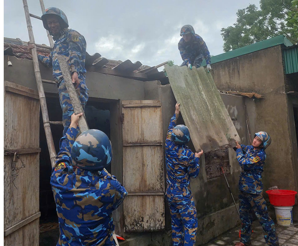 Cán bộ, chiến sĩ Hải đội 137 giúp nhân dân địa phương phòng chống bão số 10