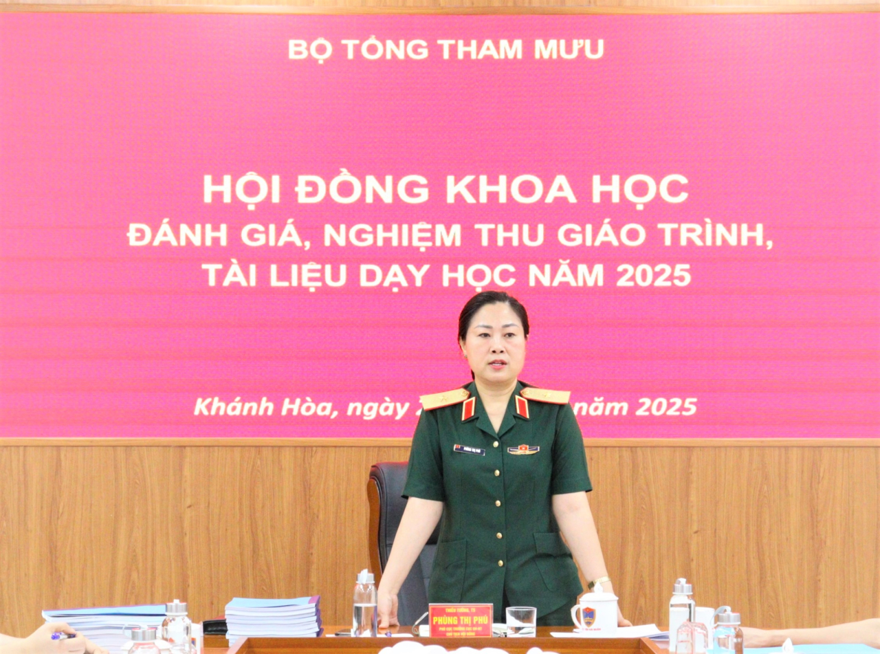Thiếu tướng, TS Phùng Thị Phú, Phó Cục trưởng Cục Quân huấn - Nhà trường, Bộ Tổng Tham mưu làm Chủ tịch Hội đồng.