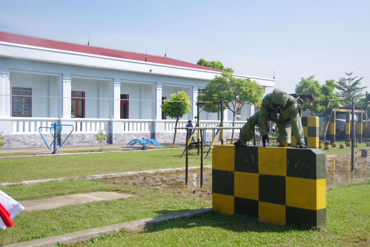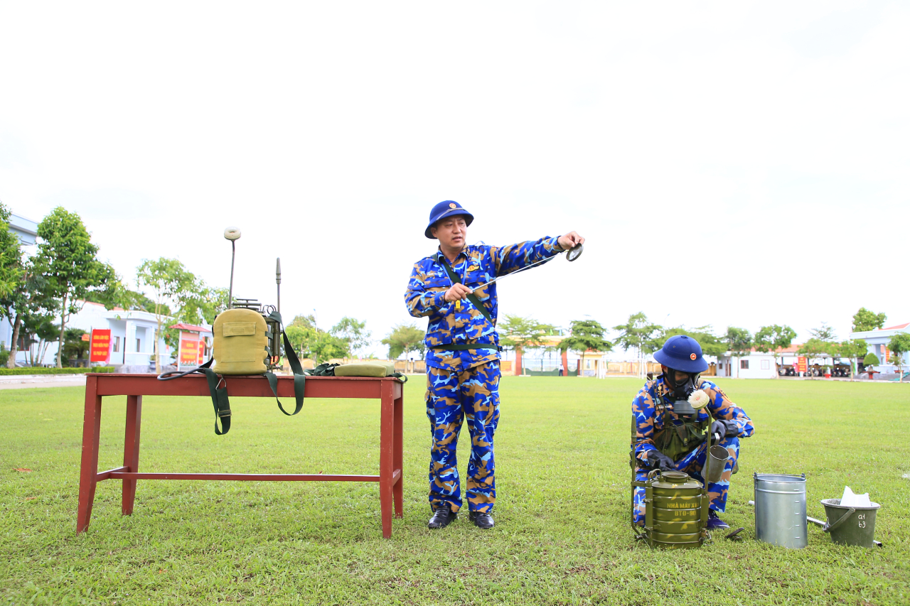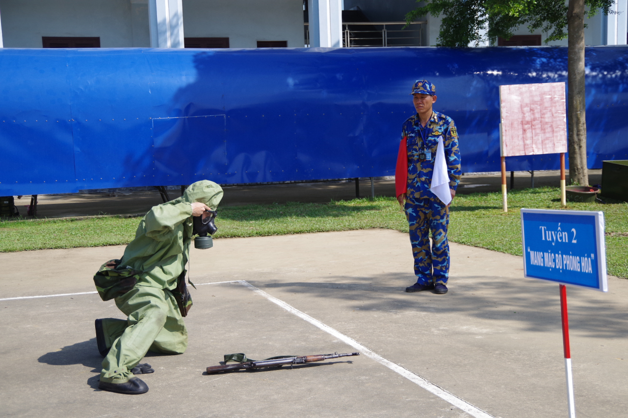 Trong bộ khí tài phòng độc, chiến sĩ hóa học vượt qua hàng loạt vật cản như: các tường cao, leo dây đứng trong màn khói, hàng bục mấp mô, "hào" lửa, hàng cọc luồn lách… Các nội dung thi đòi hỏi sức bền, kỹ thuật và sự bình tĩnh.
