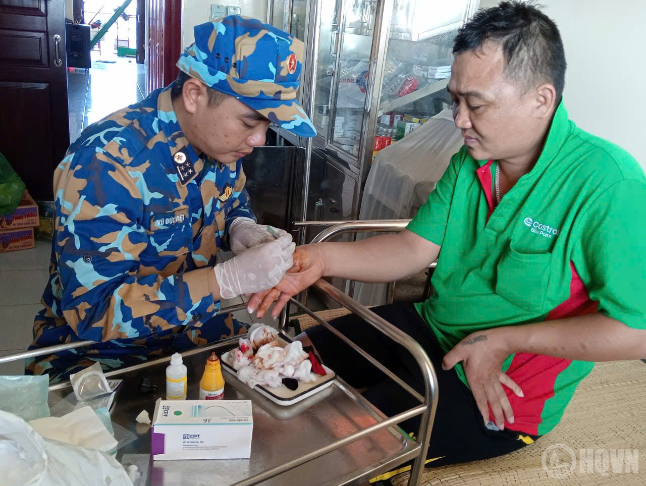 Qua thăm khám, quân y Nhà giàn DK1/7 đã tiến hành rửa vết thương, sát khuẩn, lấy dị vật và khâu 5 mũi, băng bó vết thương, đồng thời cấp thuốc và hướng dẫn sử dụng thuốc, cách thay băng, rửa vết thương cho ngư dân.