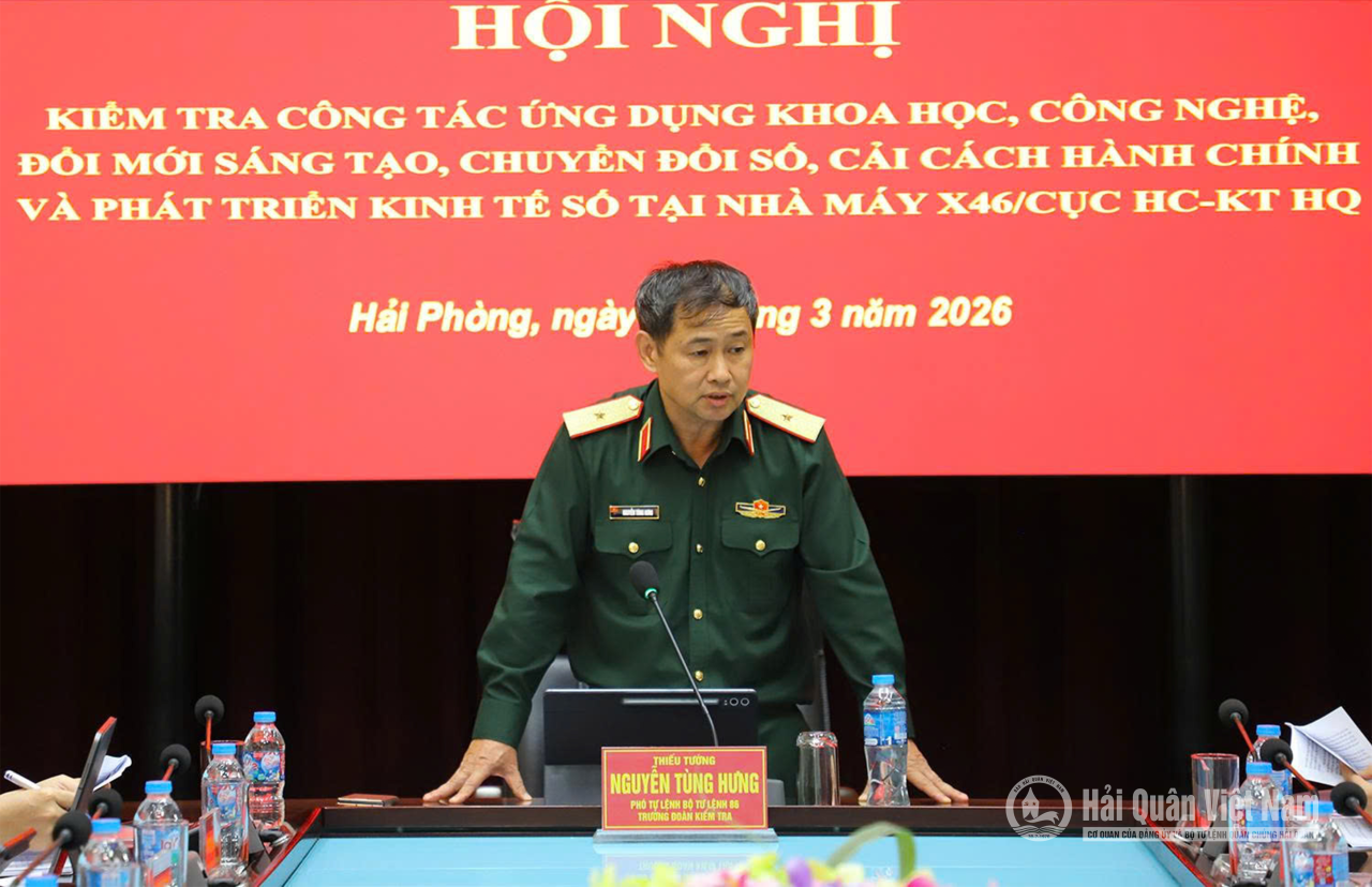 HQ Online - Chiều 30/3, tại Hải Phòng, Ban chỉ đạo 1128, Bộ Quốc phòng do Thiếu tướng Nguyễn Tùng Hưng, Phó Tư lệnh, Bộ Tư lệnh 86 làm trưởng đoàn đã kiểm tra công tác ứng dụng khoa học công nghệ, đổi mới sáng tạo, chuyển đổi số, cải cách hành chính và phát triển kinh tế số tại Nhà máy X46, Cục Hậu cần-Kỹ thuật Hải quân.