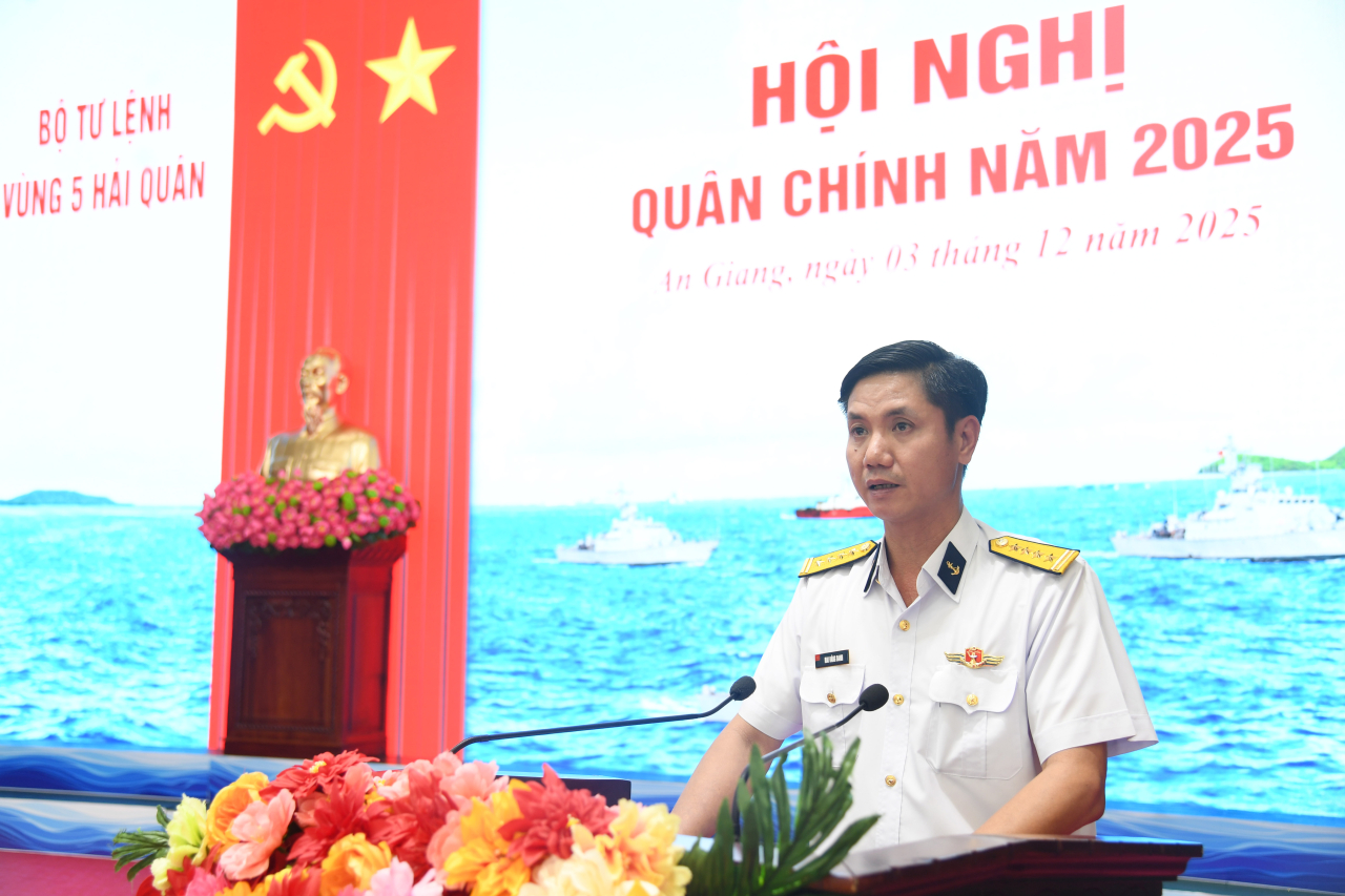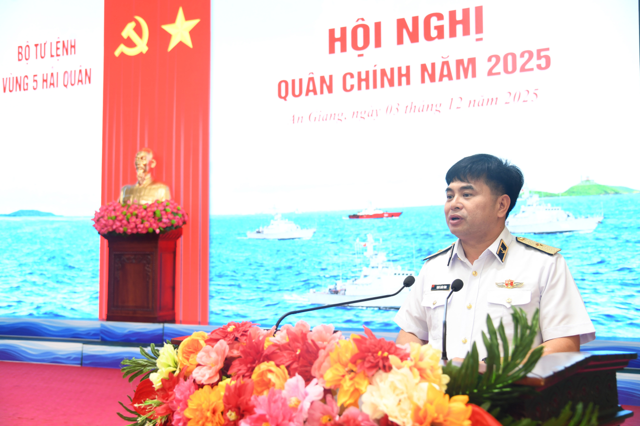 Phát biểu tại hội nghị, Phó Đô đốc Nguyễn An Phong ghi nhận, biểu dương những kết quả Vùng 5 Hải quân đã đạt được trong năm 2025, đồng thời nhấn mạnh: Vùng biển Tây Nam có vị trí chiến lược đặc biệt quan trọng, là phên dậu bảo vệ vùng trời, vùng biển phía Tây Nam của Tổ quốc. Vì vậy, Đảng ủy, Bộ Tư lệnh Vùng 5 Hải quân cần tiếp tục quán triệt sâu sắc các nghị quyết, chỉ thị của cấp trên; chủ động nắm chắc tình hình địa bàn, duy trì nghiêm chế độ huấn luyện, sẵn sàng chiến đấu, kịp thời tham mưu, xử trí hiệu quả mọi tình huống, không để bị động, bất ngờ.