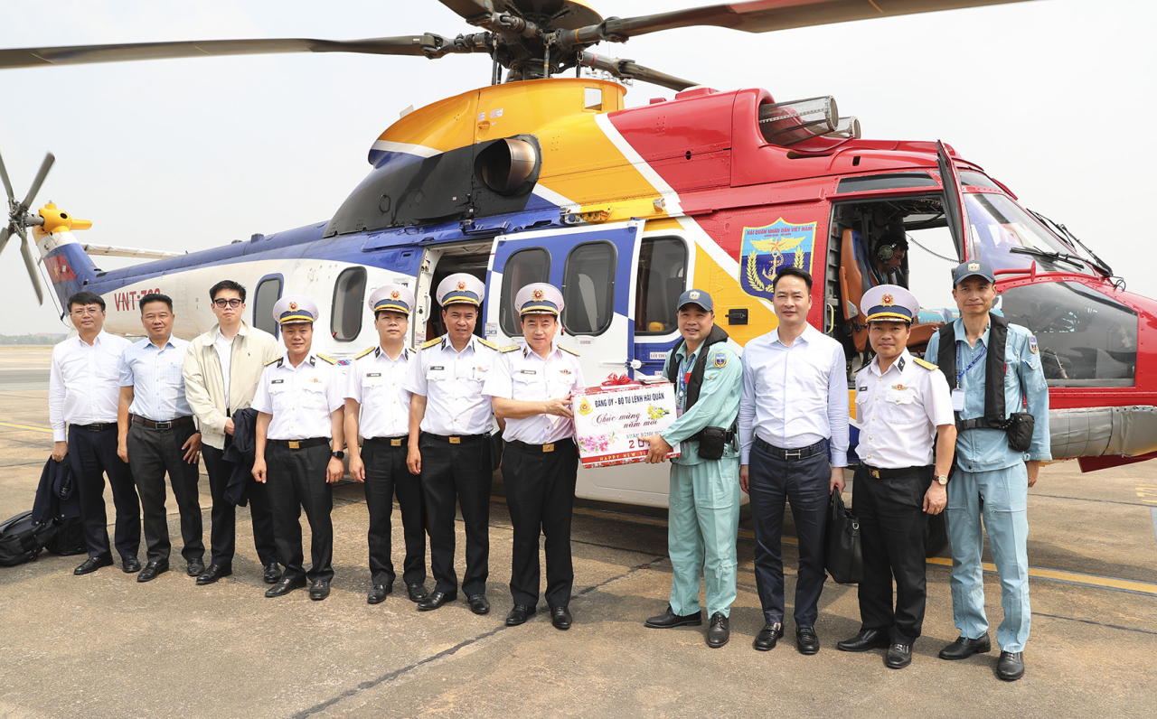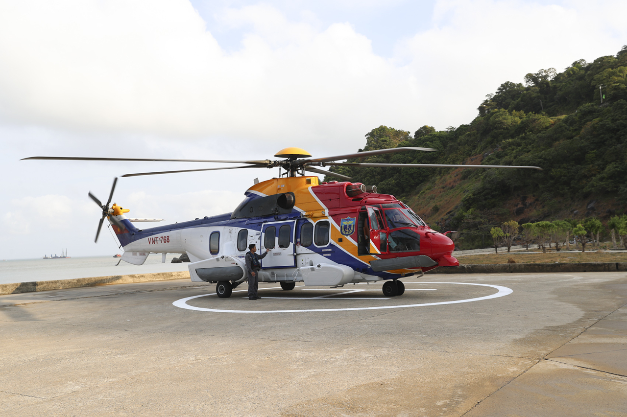 Máy bay EC-225 thuộc Lữ đoàn Không quân Hải quân 954 chở đoàn công tác hạ cánh tại đảo Hòn Khoai