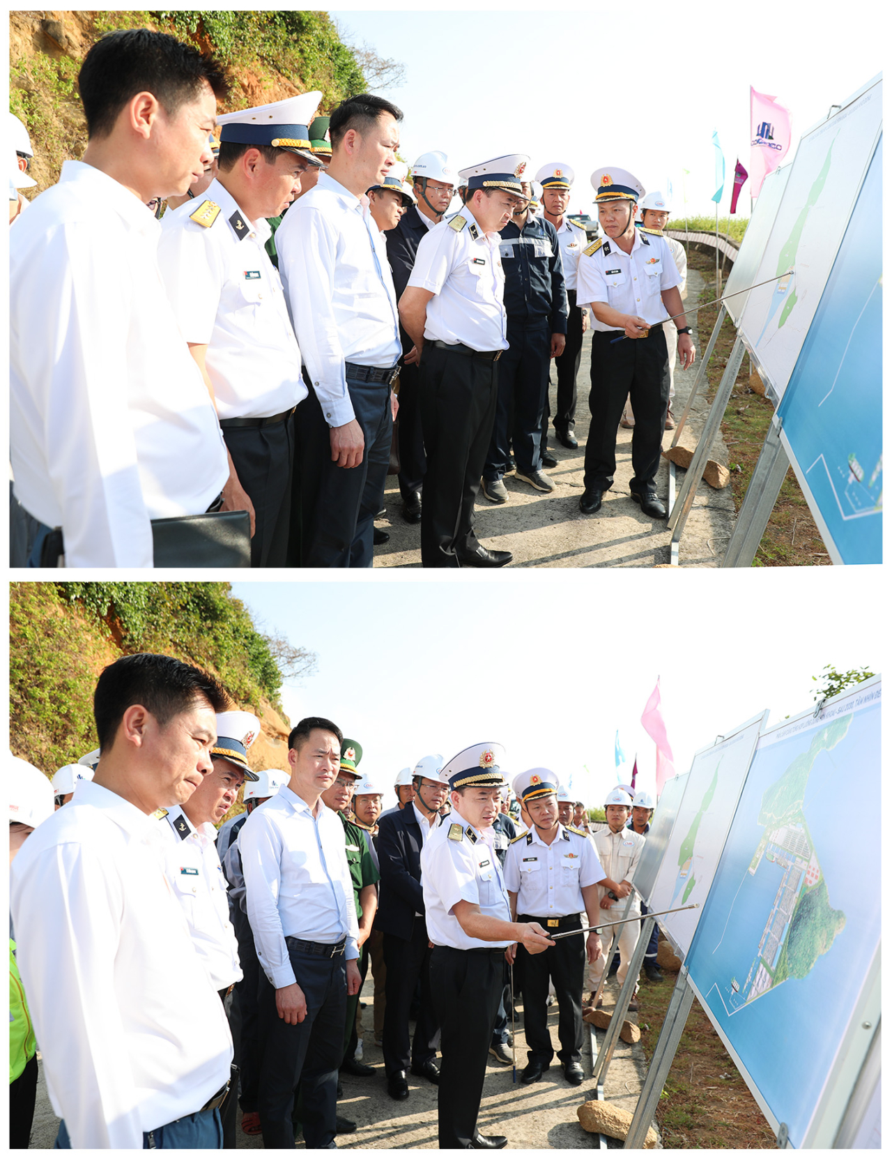Kiểm tra dự án Cảng tổng hợp lưỡng dụng tại đảo Hòn Khoai, đồng chí Tư lệnh Hải quân biểu dương và ghi nhận sự cố gắng cùng những kết quả đã đạt được của các đơn vị, nhà thầu cùng cán bộ, nhân viên, người lao động đang trực tiếp thực hiện nhiệm vụ tại dự án.