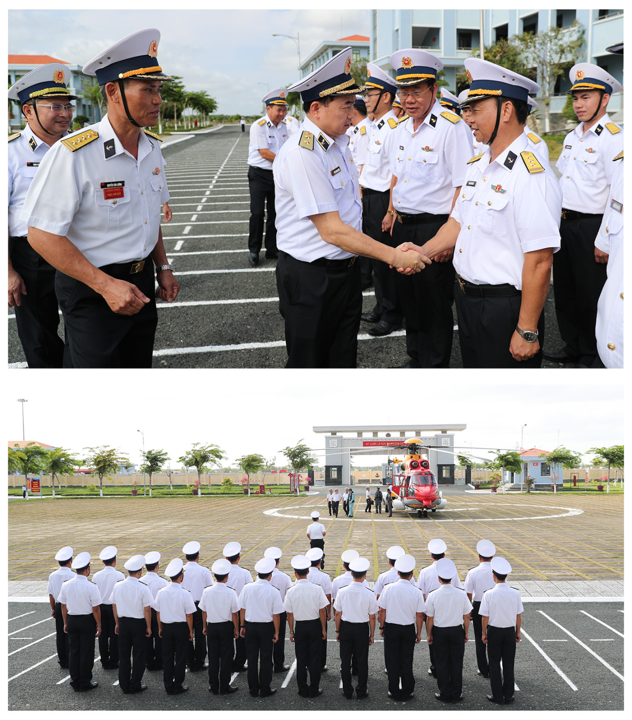 Đón đồng chí Tư lệnh Hải quân tại Lữ đoàn 175 có các đồng chí: Chuẩn Đô đốc Trịnh Xuân Tùng, Tư lệnh Vùng 5; Chuẩn Đô đốc Ngô Văn Thành, Bí thư Đảng ủy, Chính ủy Vùng 5 và đại diện các cơ quan của Vùng 5.