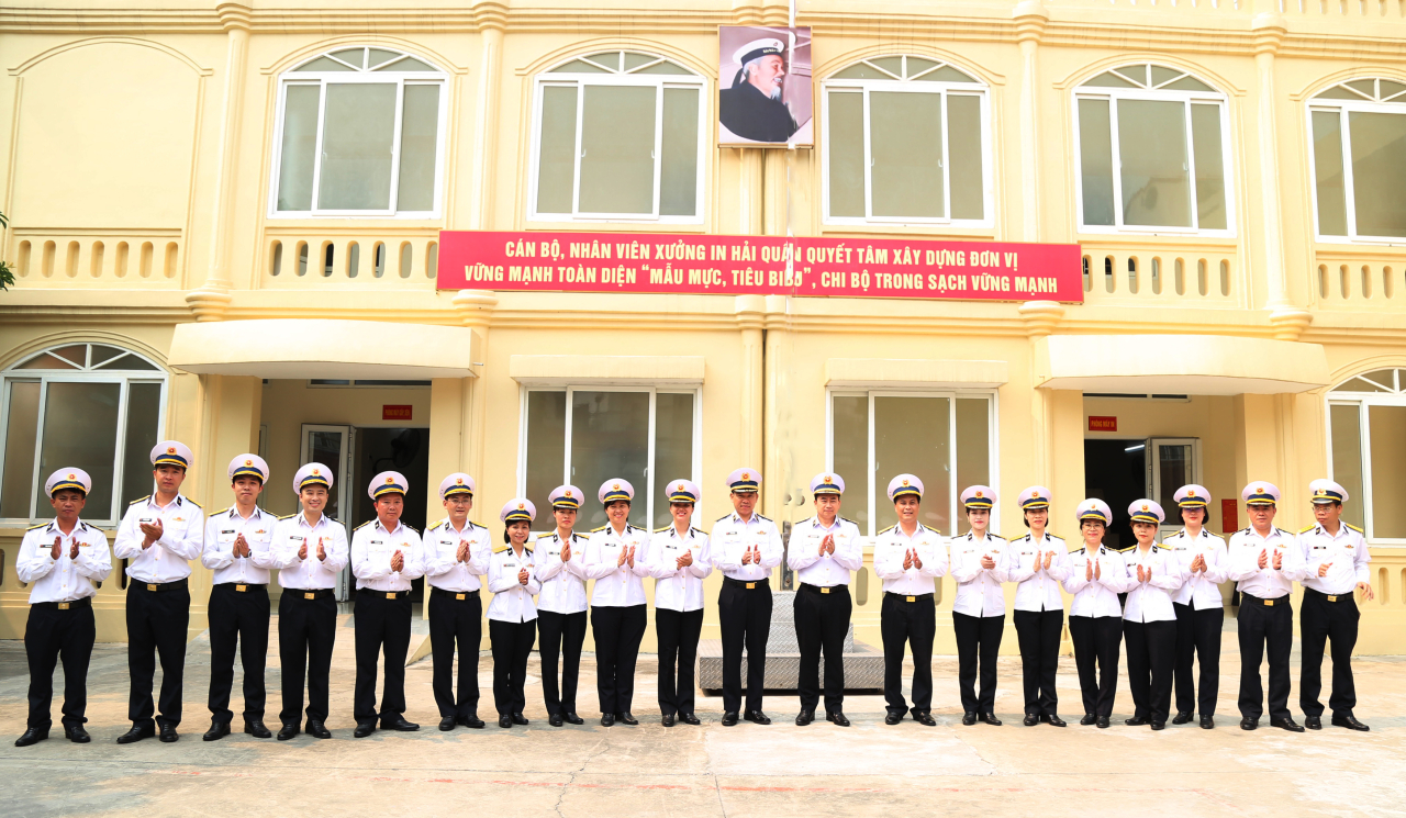 Đồng chí Tư lệnh Hải quân cùng các đại biểu chụp ảnh lưu niệm với cán bộ, nhân viên Xưởng in