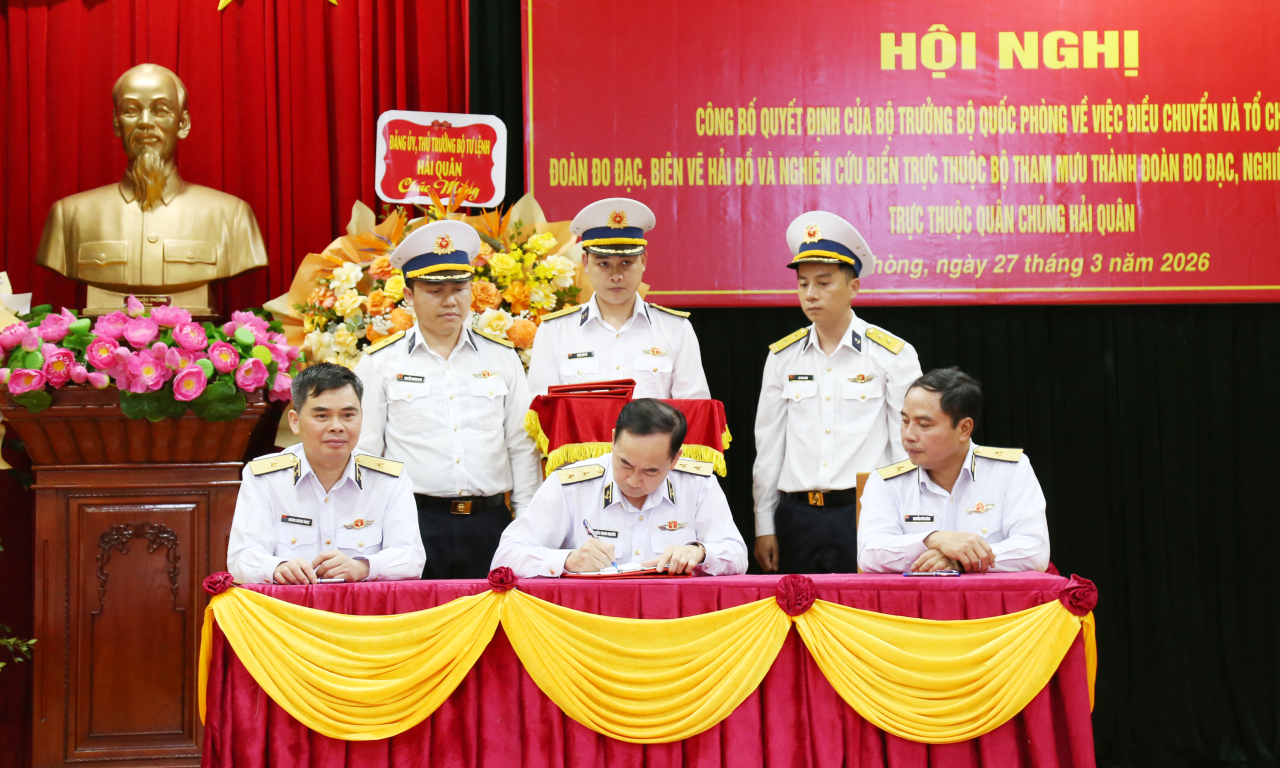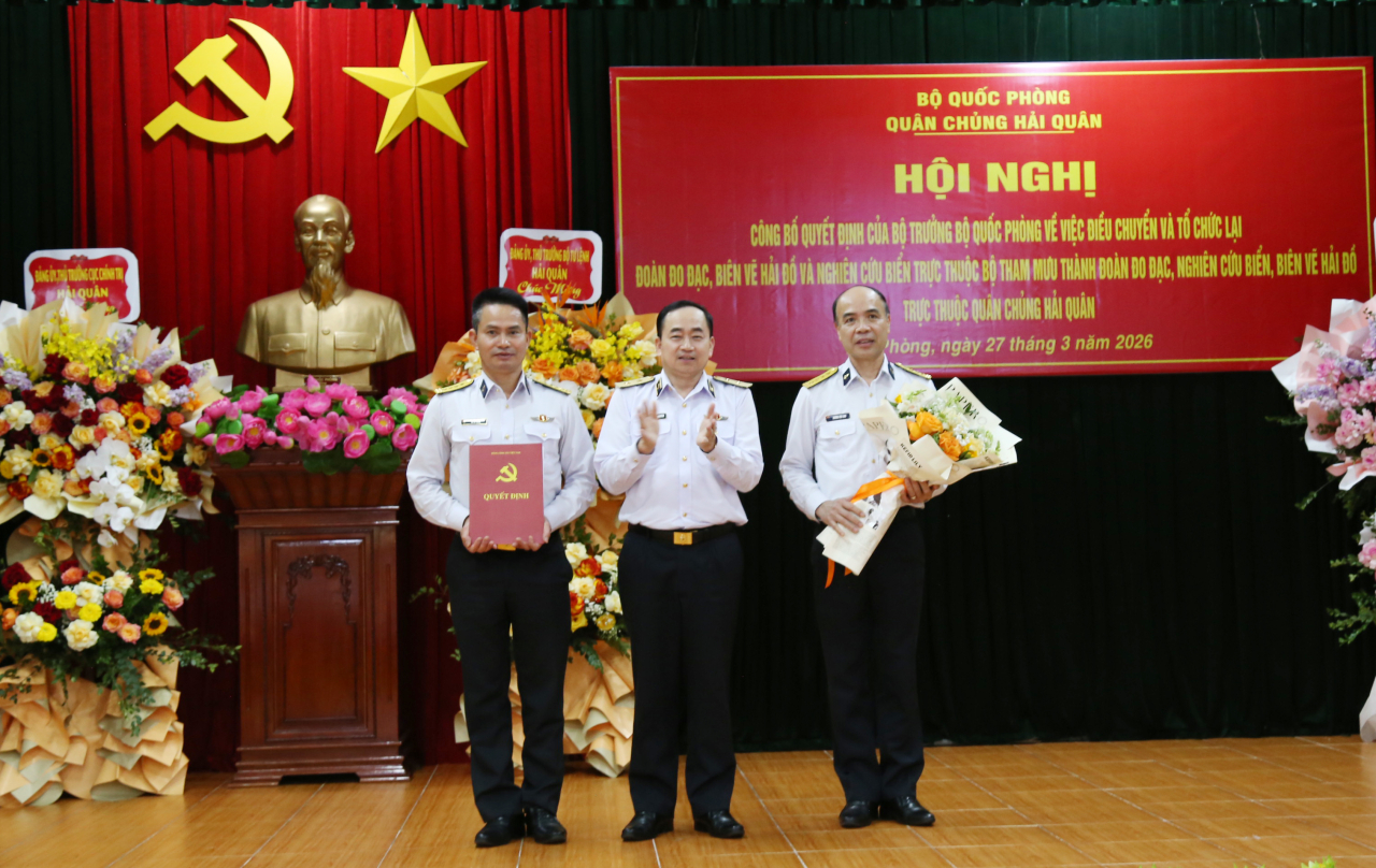 Theo đó, ngày 5/3/2026, Bộ Quốc phòng ban hành Quyết định số 986/QĐ-BQP về việc điều chuyển và tổ chức lại Đoàn Đo đạc biên vẽ hải đồ và nghiên cứu biển trực thuộc Bộ Tham mưu Hải quân thành Đoàn Đo đạc, nghiên cứu biển, biên vẽ hải đồ trực thuộc Quân chủng Hải quân.