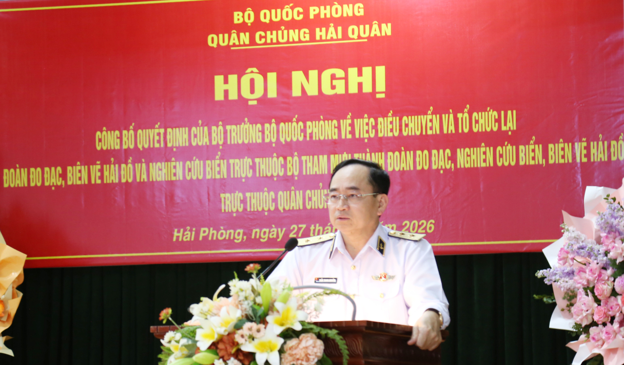 HQ Online - Chiều 27/3, tại Hải Phòng, Quân chủng Hải quân tổ chức Hội nghị công bố quyết định của Bộ trưởng Bộ Quốc phòng về việc điều chuyển, tổ chức lại Đoàn Đo đạc biên vẽ hải đồ và nghiên cứu biển. Phó Đô đốc Trần Thanh Nghiêm, Ủy viên Trung ương Đảng, Tư lệnh Hải quân dự, chủ trì. Cùng dự có Chuẩn Đô đốc Nguyễn Văn Bách, Phó Tư lệnh, Tham mưu trưởng Quân chủng; thủ trưởng Bộ Tham mưu, Cục Chính trị, Cục Hậu cần - Kỹ thuật Hải quân.