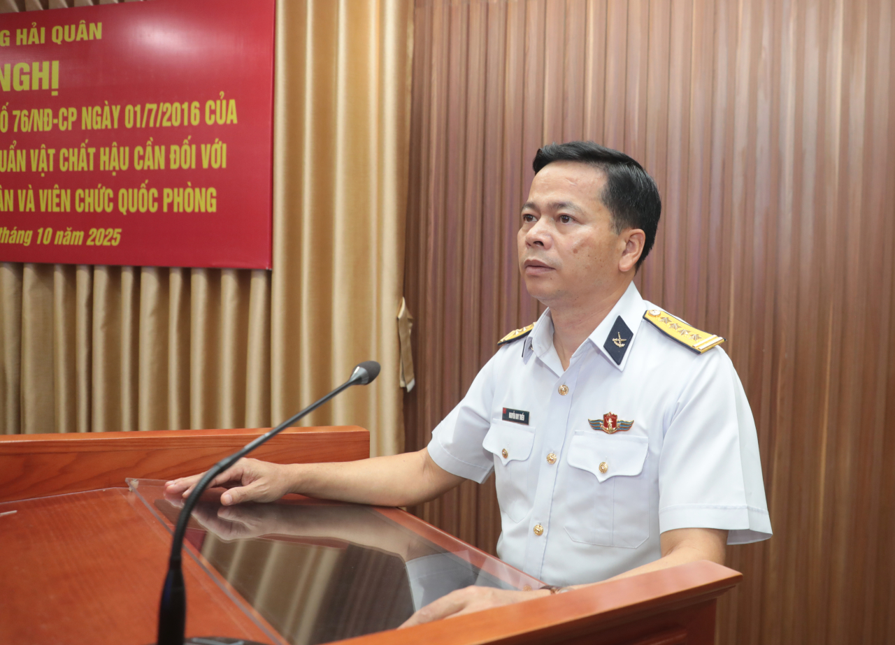 Đại tá Nguyễn Duy Thiều, Phó Chủ nhiệm Hậu cần-Kỹ thuật Hải quân báo cáo kết quả thực hiện Nghị định 76 trong Quân chủng Hải quân