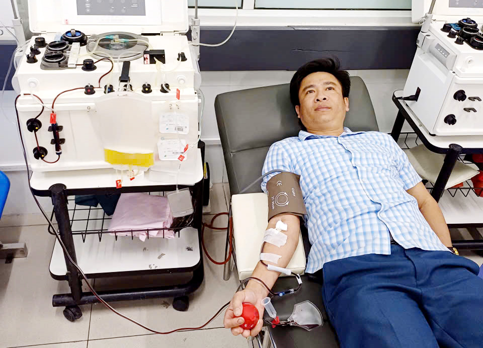 Trung tá QNCN Nguyễn Công Hiệp trong một lần hiến máu tình nguyện