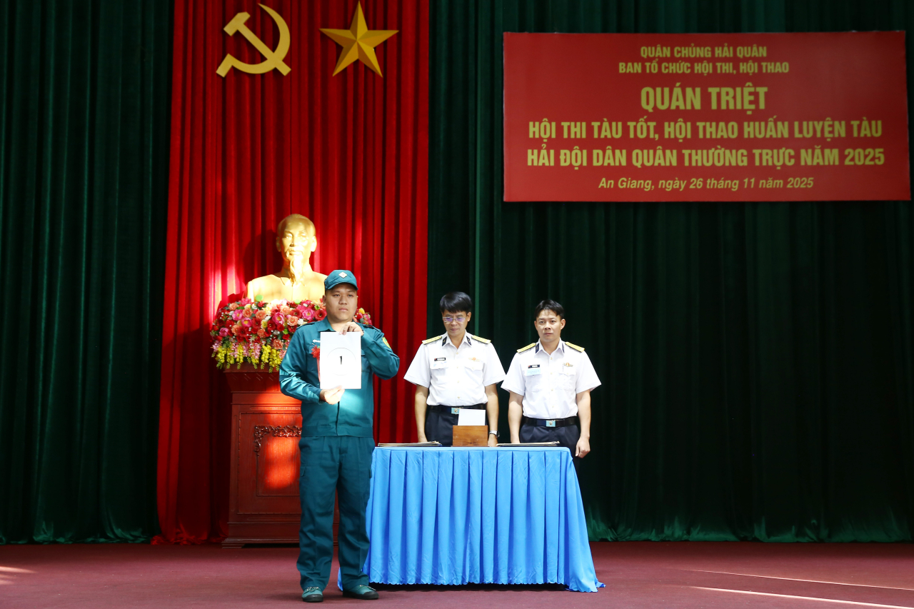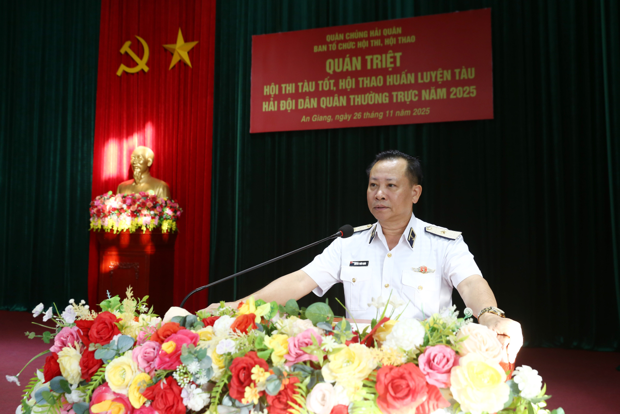 HQ Online - Sáng 26/11, tại Lữ đoàn 127, Vùng 5 Hải quân (đặc khu Phú Quốc, tỉnh An Giang), Quân chủng Hải quân tổ chức quán triệt Hội thi tàu tốt, Hội thao huấn luyện tàu Hải đội Dân quân thường trực (DQTT) khu vực 4 năm 2025. Chuẩn Đô đốc Nguyễn Thiên Quân, Phó Tham mưu trưởng Quân chủng, Phó trưởng ban Thường trực Ban tổ chức chủ trì.