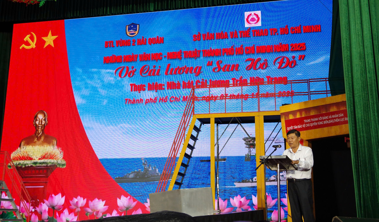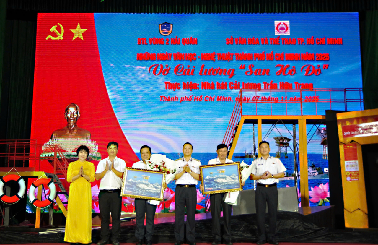 HQ Online - Hưởng ứng "Những ngày văn học - nghệ thuật TP Hồ Chí Minh", tối 7/11, tại xã Long Sơn, Bộ Tư lệnh (BTL) Vùng 2 Hải quân phối hợp với Sở Văn hóa-Thể thao thành phố và Nhà hát Cải lương Trần Hữu Trang biểu diễn vở cải lương “San hô đỏ”.
