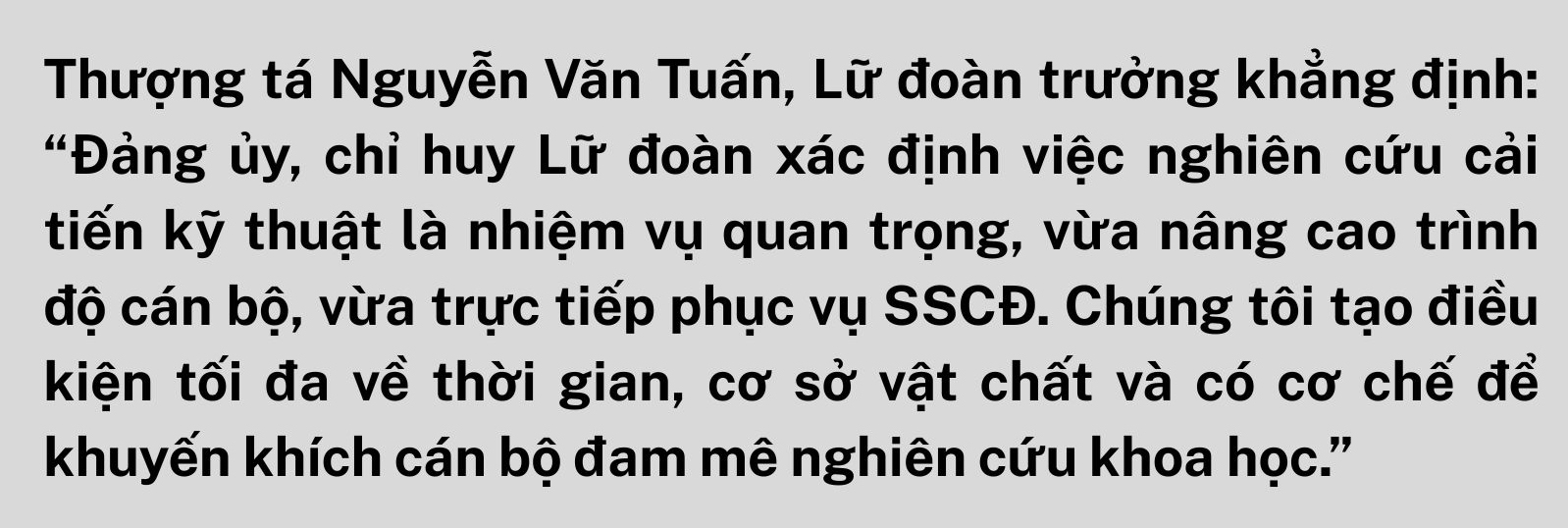 Trước thực tế đó, Lữ đoàn đã triển khai nhiều giải pháp đồng bộ như: tổ chức tập huấn chuyên sâu về nghiên cứu sáng kiến; phối hợp với đơn vị bạn hoặc mời chuyên gia trong và ngoài quân đội đến huấn luyện, chia sẻ kinh nghiệm. Trên cơ sở kết quả nghiên cứu, đơn vị kết nối với các cơ quan liên quan chế thử, nâng cấp một số thiết bị, vật tư. Để khuyến khích cán bộ tích cực nghiên cứu, Lữ đoàn kiến nghị các cấp tăng kinh phí nghiên cứu cơ sở hằng năm, điều chỉnh cơ chế công nhận sáng kiến theo hướng linh hoạt hơn, rút ngắn thời gian thẩm định…