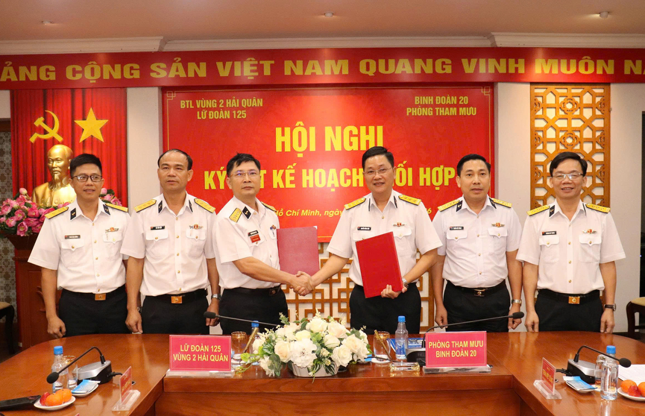 HQ Online - Chiều 28/1, tại Cụm cảng Tân Cảng Cát Lái, Lữ đoàn 125, Vùng 2 Hải quân đã tổ chức ký kết kế hoạch phối hợp với Phòng Tham mưu, Binh đoàn 20 về công tác bảo đảm an ninh cảng biển, an toàn hàng hải, trật tự an toàn giao thông, phòng chống cháy nổ, tìm kiếm cứu nạn và bảo vệ vùng trời khu vực Cụm cảng Tân Cảng Cát Lái và Lữ đoàn 125. Đại tá Nguyễn Đình Lịch, Lữ đoàn trưởng Lữ đoàn 125 và Thượng tá Nguyễn Hồng Kiên, Tham mưu trưởng Binh đoàn 20 đồng chủ trì.