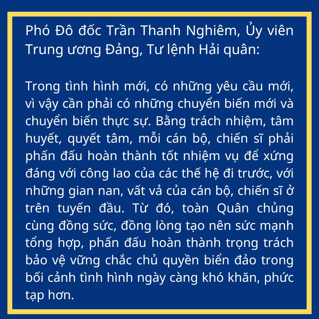 Đồng chí nhấn mạnh: Năm 2026, dự báo tình hình thế giới, khu vực, trên biển tiếp tục diễn biến nhanh, khó đoán định. Do đó, việc nắm, phân tích, đánh giá, dự báo đúng tình hình phải đặt lên hàng đầu, phải sâu hơn, toàn diện hơn; từ đó kịp thời tham mưu, đề xuất, xử trí kịp thời, hiệu quả các tình huống, không để bị động, bất ngờ; góp phần bảo vệ vững chắc chủ quyền biển đảo Tổ quốc.